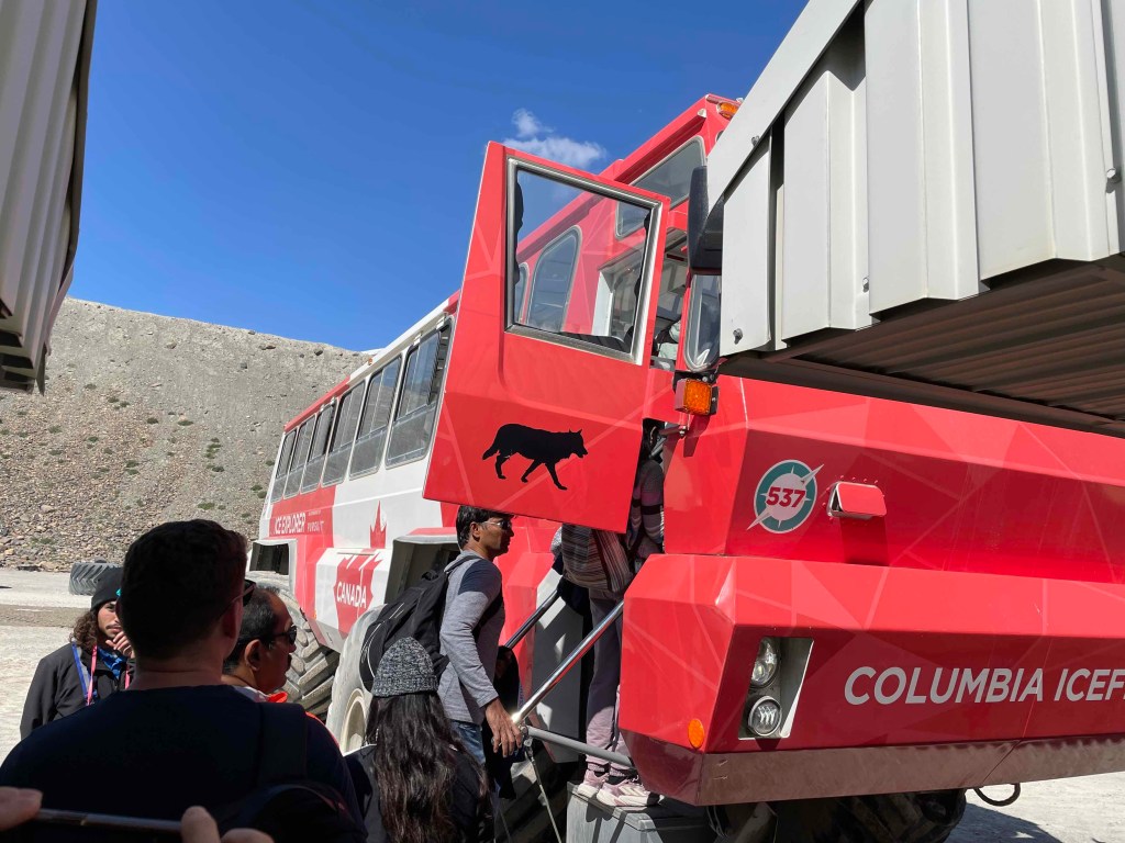 And there we were already at 10 am in front of the glacier. The car park was already well filled. We first had to get our bearings, because not only is the glacier big, the entire visitor centre had to adapt to the rush. At the ticket office we were offered to join the tour three quarters of an hour earlier. That way we didn’t have to wait two hours for our slot. Wrapped up and a little fortified, we first went to the station in normal coaches, where we were loaded into a kind of lunar vehicle. A giant box on four wheels that were bigger than tractor tyres and were said to cost a whopping 6000 dollars. We were welcomed by Chris from Edmonton, our driver and guide. And then the show began. The drivers here are all pure entertainers. He kept the group entertained, told about the glacier and stories in a funny way, made jokes – entertained the bus. And on the side, he drove this contraption. The most exciting part was when it went steeply down the moraine to the glacier ice. Here, at the latest, everyone knew why he / she had to fasten seatbelts. And here are the Chris jokes.