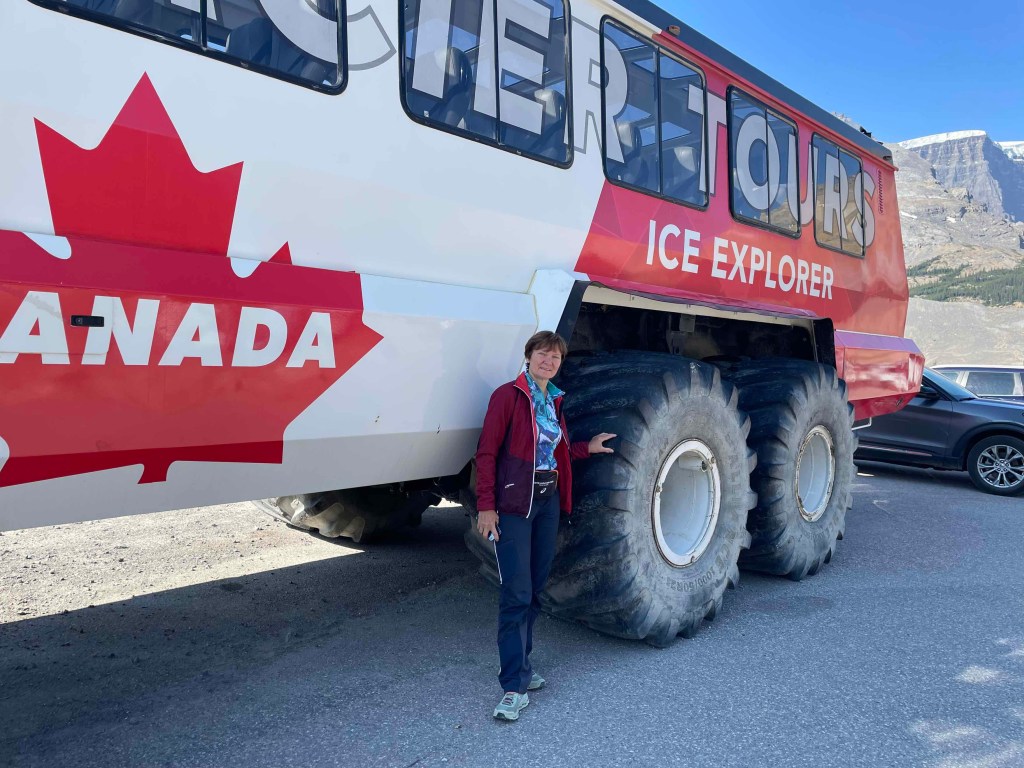 Und da standen wir schon um 10 Uhr vor dem Gletscher. Der Parkplatz war bereits gut gefüllt. Wir mussten uns erst einmal orientieren, denn nicht nur der Gletscher ist groß, das gesamte Besucherzentrum musste sich dem Ansturm anpassen. Am Ticket office bot man uns an, eine Dreiviertel Stunde früher die Tour mitzumachen. So mussten wir nicht zwei Stunden auf unseren Slot warten. Eingemummelt, bisschen gestärkt ging es erst mit normalen Reisebussen zur Station, wo wir in eine Art Mondfahrzeug verladen wurden. Ein Riesenkasten auf vier Rädern, die größer waren als Traktorreifen und schlappe 6000 Dollar kosten sollen. Wir wurden von Chris aus Edmonton, unserem Fahrer und Guide willkommen geheißen. Und dann begann die Show. Die Fahrer sind hier alle die reinsten Entertainer. Er hielt die Gruppe bei Laune, erzählte über den Gletscher und Geschichten auf witzige Art, machte Späße – unterhielt den Bus. Und nebenbei fuhr er dieses Gerät. Die aufregendste Stelle war als es die Moräne steil hinunter zum Gletschereis ging. Spätestens hier wusste jeder, warum er / sie den Gurt anlegen musste. Und hierbei noch die Chris Witze.