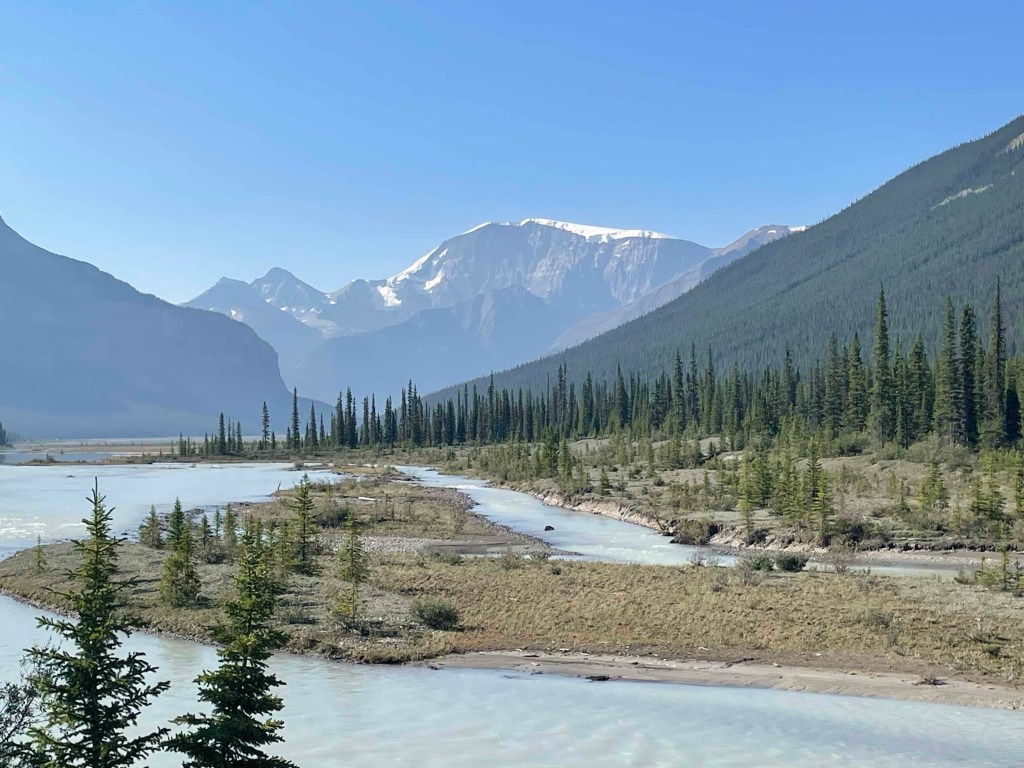 Angehalten wurde aber nur an diversen Hotspots (gefühlt um die 10), um Fotos zu machen: Wasserfälle, Berge in allen möglichen Formationen und Berge, die von Kurve zu Kurve größer werden. Ach Quatsch, der Icefield Park Highway hat gar keine Kurve, höchstens eine riesengroße direkt hinterm Gletscher. Er verläuft sonst über hunderte Kilometer geradeaus und schlängelt sich durch die grauen Giganten, dichte Wälder, entlang wilder azurfarbener Flüsse oder fast vertrockneten Flussbette. Auf diesen hohen Riesen, bestimmt 3500 Hm zeigte sich immer mehr Schnee. Wie eine Schicht auf der Spitze des Berges oder entlang eines Kamms. Das ist schon der Gletscher.
