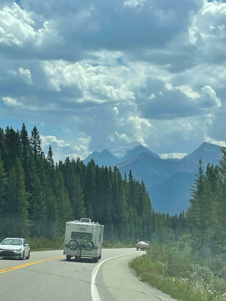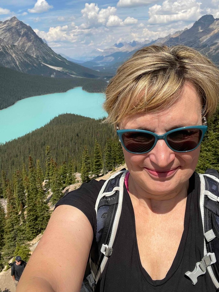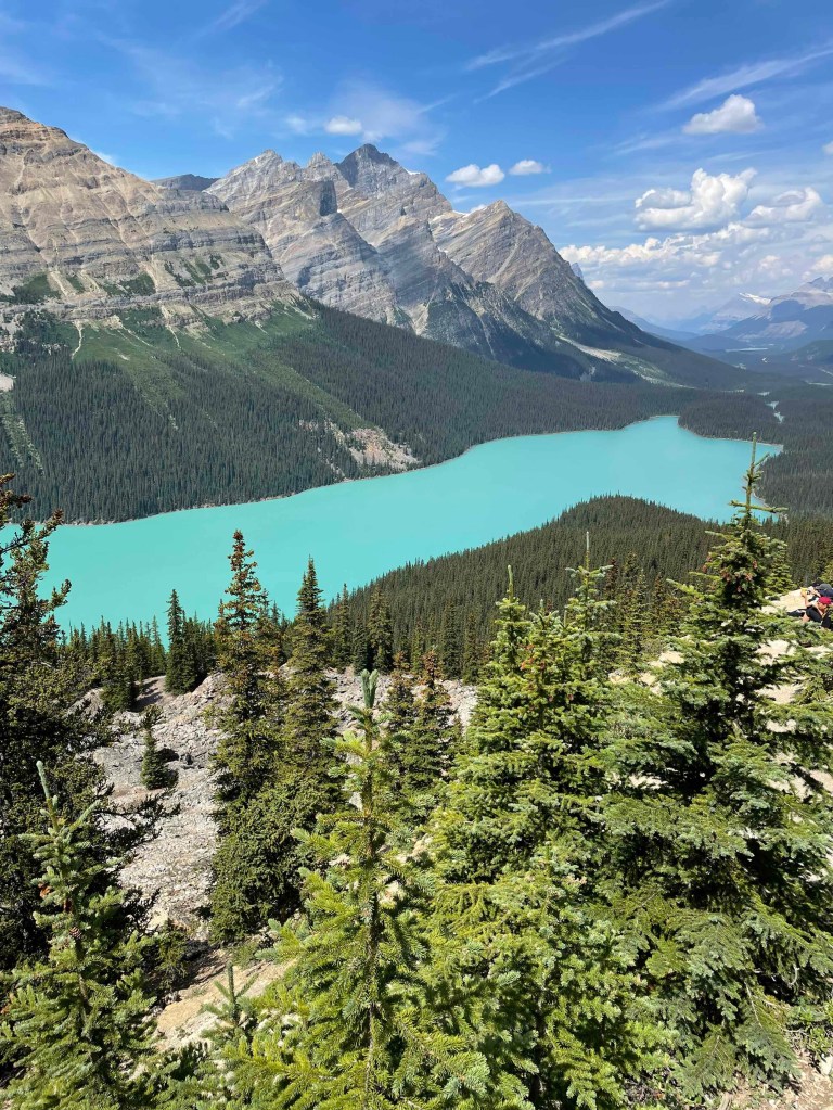 Am Bow Lake stoppten wir Fotos mit See und Gletscher. Es waren so viele Menschen am Wasser. Vor allem aus Indien. Frauen in Saris und Männer mit ihren Turbanen standen im Wasser. Das hatte schon etwas Pilgerhaftes. Wir fuhren weiter in Richtung Peyto, einen See, den man nicht direkt betreten kann. Auch hier war der Parkplatz gut befüllt. Durch das Kommen und Gehen kam man aber ganz unproblematisch an einen Parkplatz. Kleiner Fußmarsch zum Peyto Viewpoint. Es ging geradeaus, immer bergauf. Endlich kommt man mal in Bewegung. Und da standen wir oberhalb des Sees. Der Gletscher zur linken. Wow! Diese Farbe, dieses Türkis. Wer hat die da reingekippt? Auch wenn die Plattform ziemlich gefüllt war, wir genossen den Ausblick. Ich malte mir aus, wie lebensunfreundlich das hier vor ca 6 Monaten aussah. Alles weiß und zugefroren. Keine Menschenseele. Vielleicht ein paar Elche, die im Schnee nach Futter wühlen. Bären halten in ihren Höhlen Winterschlaf.