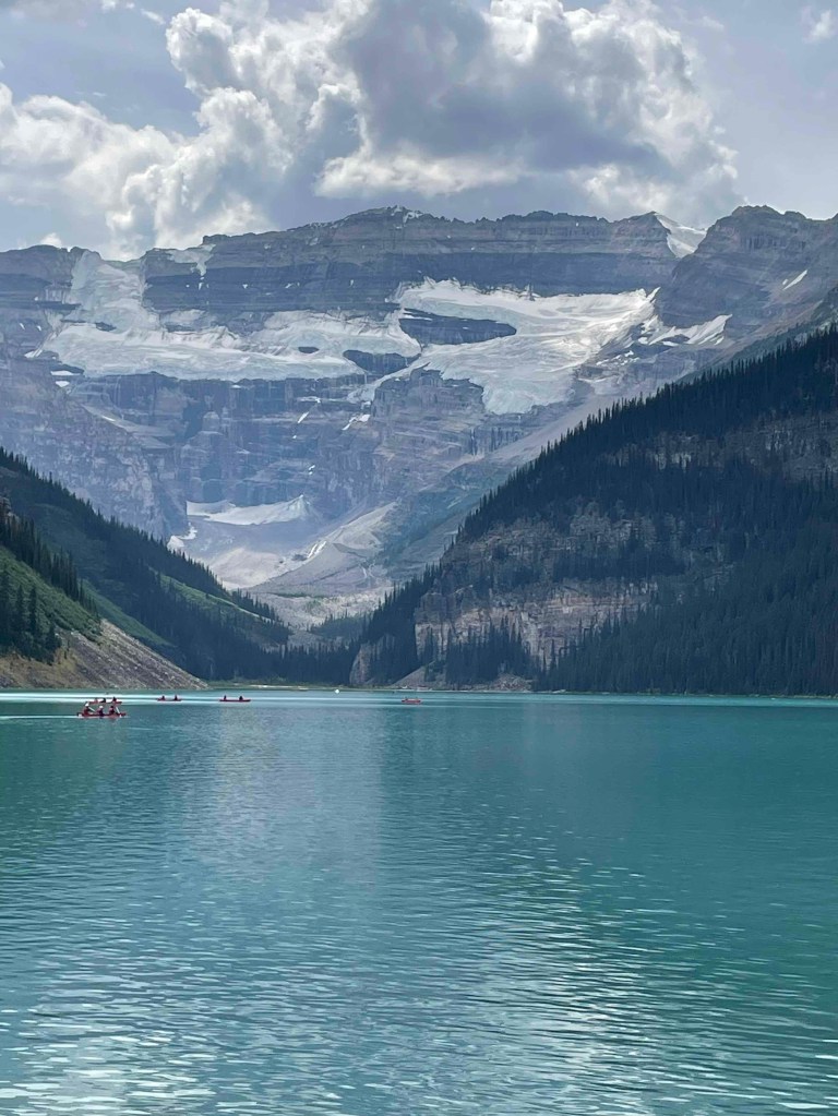 To the right, the Chateau Lake Louise, a hotel that looks more like a bunker than a castle. So ugly. Poor lake, poor glacier. But how do you do justice to this crowd of people. Everyone wants to go there. Taking photos to show off.
