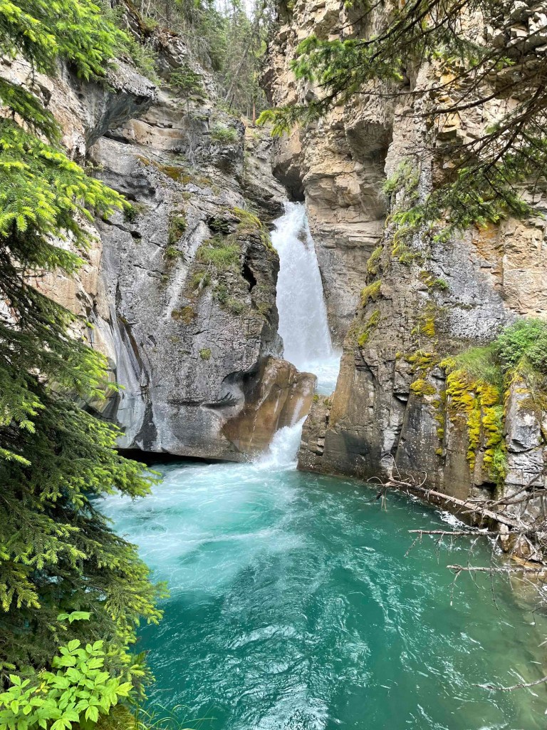 However, the day was far from over. There are supposed to be waterfalls behind our hut. Let’s go and explore them. A bridge leads over 3 km along the cliff up to the waterfalls. Below, the stream rushes down, almost like in a gorge. But here, too, it was a mass migration. Unbelievable! Now still. It’s almost 6 pm. At the first waterfall there was a queue at the entrance to a cave. What or who is in there? We passed on this surprise, because it all took too long for us. We preferred to enjoy the warm summer evening in Johnston Canyon.