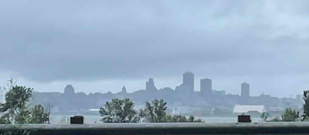 We still had a 2-hour drive ahead of us. Towards the north. The rain had eased a little. The clouds still hung very low. And the fine drizzle turned into a shower again. It wasn’t worth driving on the road along the Saint Lawrence River. We wouldn’t have seen much. We stayed on the highway, letting much too fast trucks overtake us. At the petrol stations heading north, the prices became astronomical. Here it’s $1.80 at the moment.