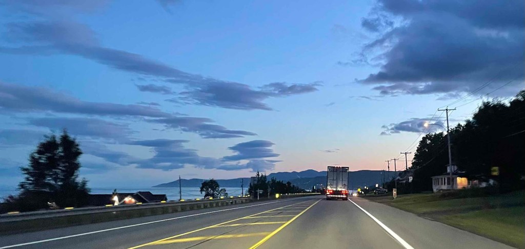 Still, I was happy and content and frozen through, like when I was in the Azores and saw my first sperm whale and the fin also appeared out of nowhere. We came back in the dark. The rain stopped and we could make out the dark mountains along the Saint Lawrence River and the shore opposite. Maybe tomorrow the weather will stay a bit nicer and we can enjoy this one in daylight on our way back towards Toronto.