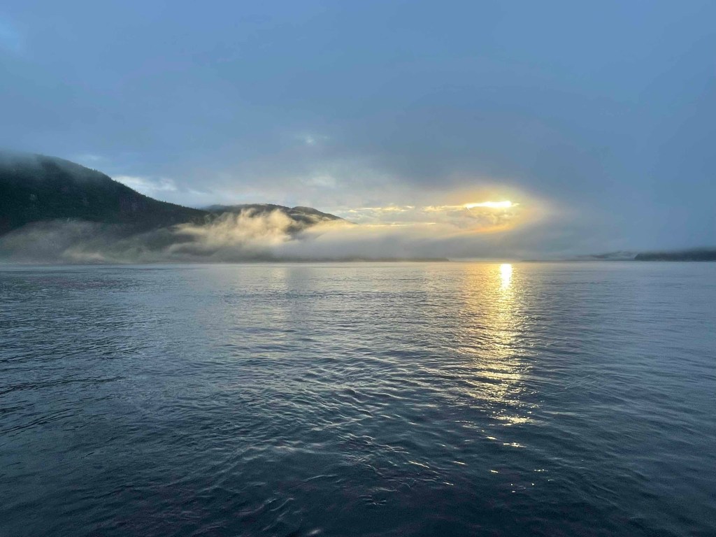 Auf dem Rückweg fuhren wir in den Fjord hinein, in den Nebel durch den die Sonne schien. Eine verrückte, einzigartige Atmosphäre. Die Fähren kreuzten den Fjord im Nebel. Und ein paar Belugas ringsherum.