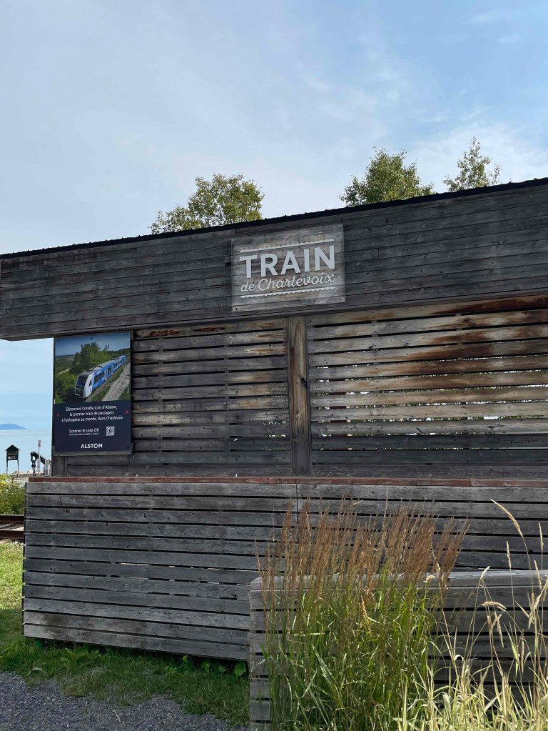 Short stop in St-Irène – seems to be an artists‘ village. See the arrow in the middle of the landscape. Everything here reminds me of Scandinavia. The landscape, the colourful wooden houses. There is even a miniature railway station right on the beach for summer visitors from the city? The platform is maybe 10 metres long. How long is the train then? Unfortunately, I haven’t seen a train here yet. But maybe the whole thing is just an art object. A few brave people were in the ice-cold water. I just remembered that I took the bikini for nothing. Except for the white-water rafting, there was no opportunity for a swim.