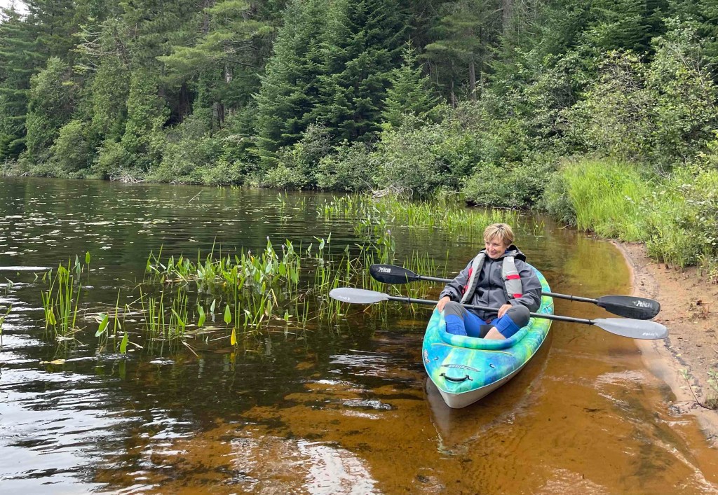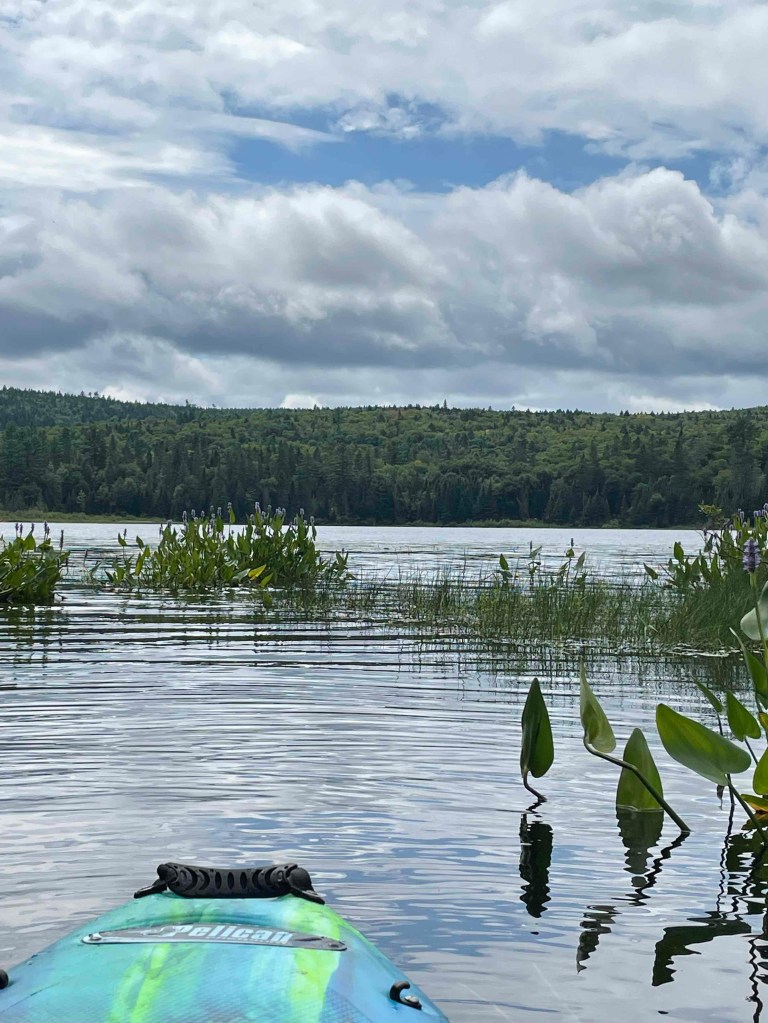 Gesagt. Getan. Mit dem Nationalparkpass, der uns schon sehr zugute kam, fuhren wir tief hinein in den Parc nationale de la Mauricie. Unser Ziel war der See Lac Wapizagonke. Dort soll es nach Auskunft der anderen Gäste in der Herberge eine Kanuausleihstation geben. Auch wenn das Kanu doch eher mit Kanada verbunden wird, entschieden wir uns fürs Kayak. Die Ausleihe war etwas kompliziert. Man musste sich erst registrieren und ein Quiz lösen, in dem Sicherheitsmaßnahmen abgefragt wurden, wie zum Beispiel: Wie muss das Boot stehen, wenn der Wind sehr stark ist? Oder was muss man tun, wenn ein Gewitter aufzieht? Natürlich sich unter den nächst besten freistehenden Baum stellen. Wir bekamen trotzdem ein Kayak, wählten nach Farbe, schön bunt, nicht nach Funktionstätigkeit. Das war vielleicht ein Fehler. Ich setzte mich ins Kayak und mein Hintern war erstmal nass. Jemand hat vergessen, das Wasser rauslaufen zu lassen. So hätte eine Quizfrage lauten sollen: Wie bekomme ich das Wasser aus dem Kayak?