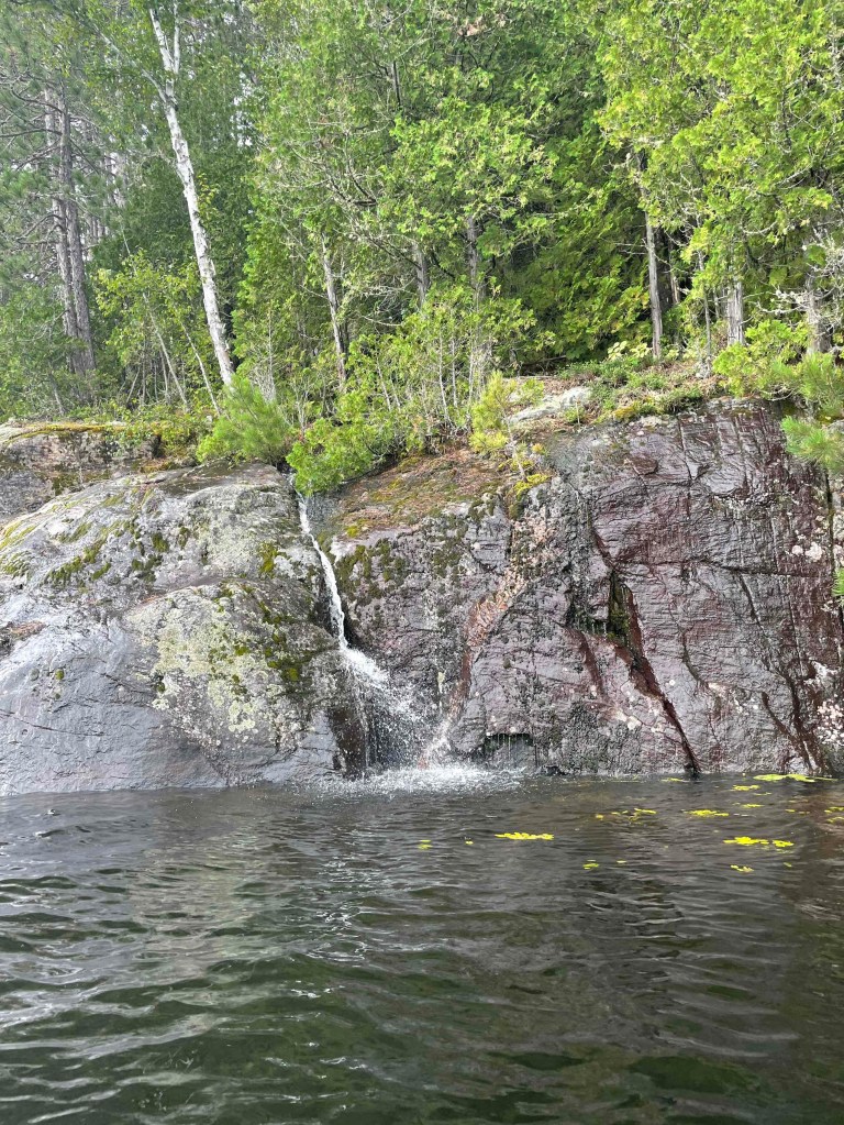 Und kaum waren wir auf dem See, fing es an zu nieseln. Immer mal. Aber wir sind nicht aus Zucker und werden das schon aushalten. Ohne richtiges Ziel paddelten wir am Ufer entlang, quer über den See zum anderen Ufer. Alex sprang sogar ins Wasser, denn das war viel wärmer als die Luft. Wir hatten keine Handtücher dabei, sonst hätte ich es auch versucht. Es gibt sogar einen Miniwasserfall und einen angestauten kleineren See, aber keinen Kanal, durch den wir durchpaddeln können. Quer über den See, gegen Wind und Wellen und Nieselregen quälten wir uns zurück. Mein Hintermann war nass von meinen Paddelkünsten. Sorry.