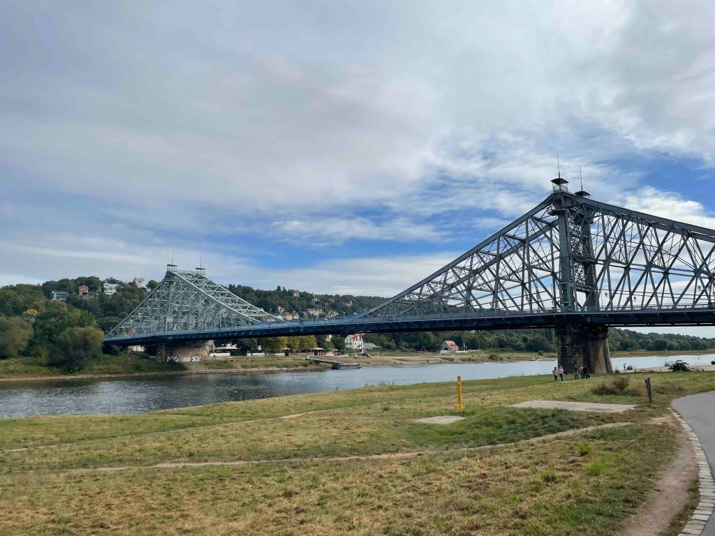 Erlebnis Deutsche Bahn. Aber sie kam pünktlich in Dresden-Neustadt an. Ohne Abstecher zu irgendwelchen Sehenswürdigkeiten ging es direkt zum Elberadweg. Mit Fähre, die Deutschlandticket akzeptierte, aber auf der Fahrräder trotzdem bezahlt werden müssen, kreuzten wir den Fluss zum ersten Mal und fuhren bis zu unserem Ziel linksseitig durch die Dresdner Elbwiesen, hinaus aus Dresden, entlang hübscher Villen, Schlösschen, Cafés und Restaurants. Ausflugsdampfer begleiteten uns entlang des Flusses. Manchmal waren wir viel schneller.