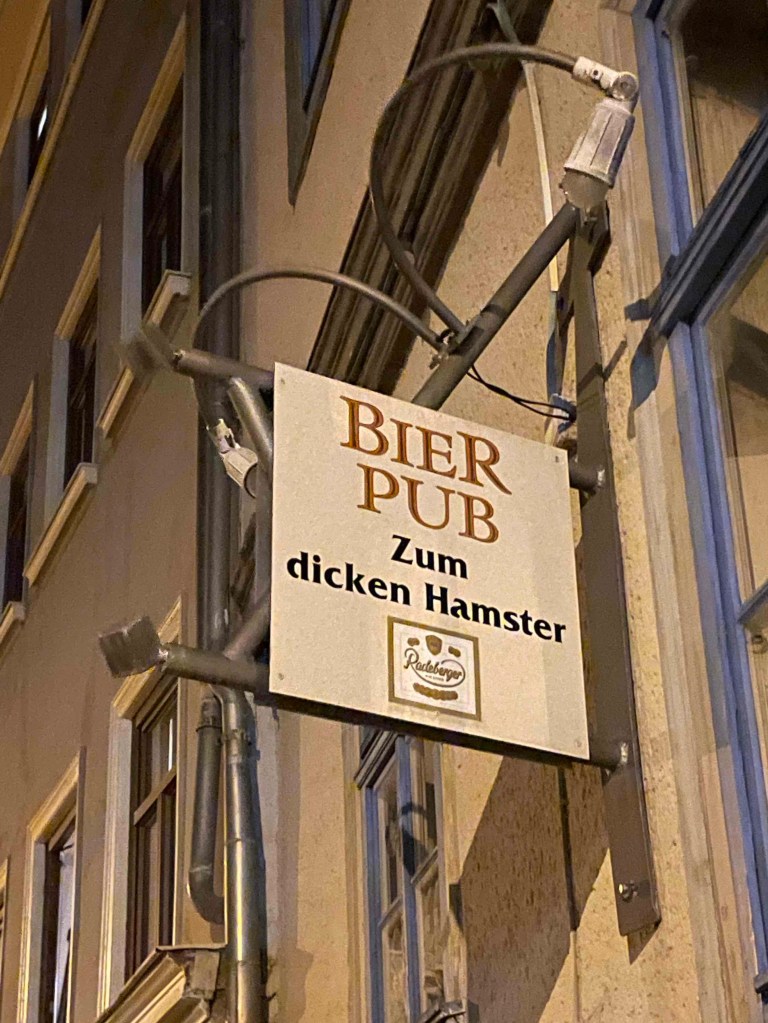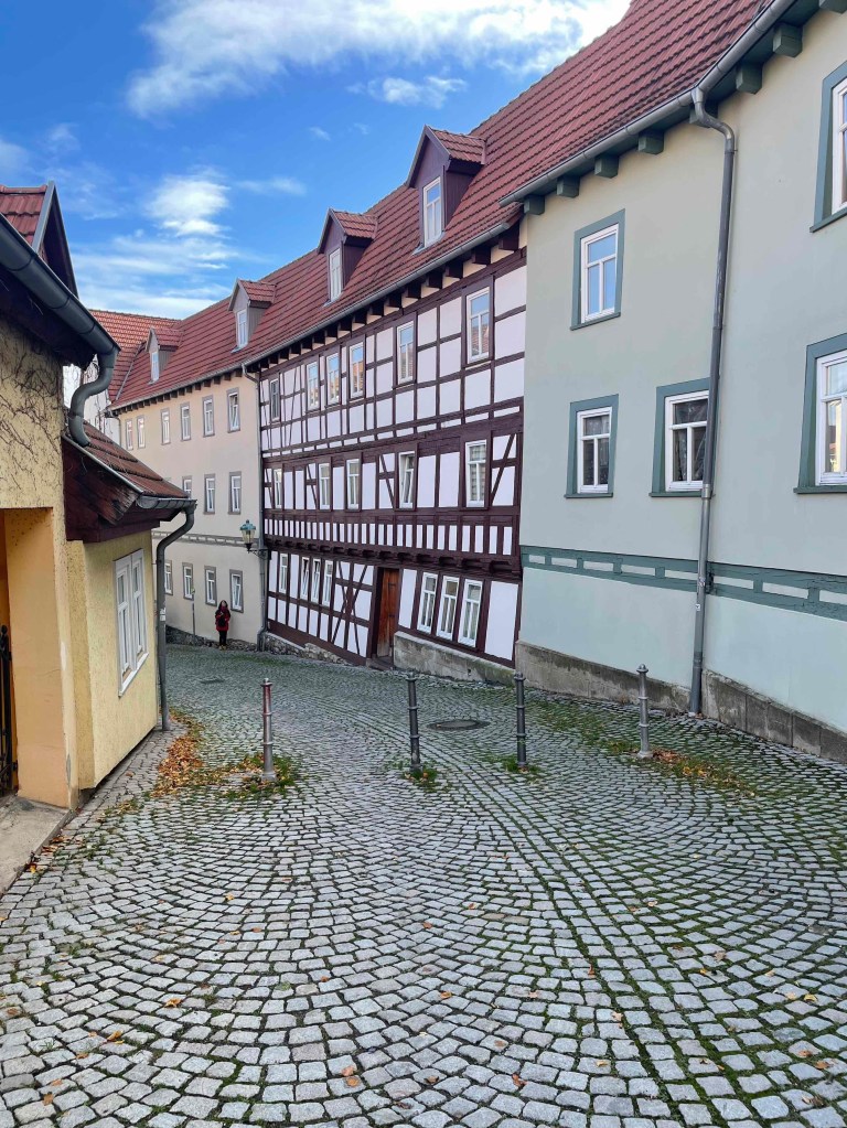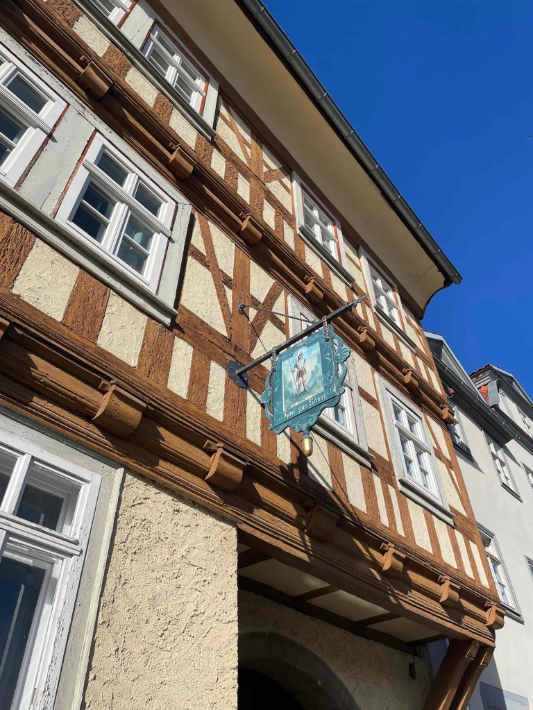 Doch nun musste ich in der Dunkelheit das Restaurant finden, in dem meine Freundinnen saßen und auf mich warteten. Alle Jahre wieder: die leidige Suche nach einem Restaurant. Unser Hotel zur Brauerei in Arnstadt hatte zwar Zimmer für uns, aber keinen Tisch. Wie traurig. Personalmangel?! Wahrscheinlich. Glücklicherweise fand die Organisatorin des Treffens 2023, Yvette, den Burgkeller, in dem traditionelle, regionale Küche angeboten wurde. Auch in vegetarisch für die Vegetarierinnen unter uns. Und wieder, wie auch schon im letzten Jahr, war ich die Letzte im Bunde, die eintraf. Hungrig, durstig, müde, voller Eindrücke von dieser verrückten Zugfahrt ab Erfurt und meinem Spaziergang durch Arnstadt, in der an einem Freitagabend wie wahrscheinlich an jedem Abend ab 6 die Bürgersteige hochgeklappt werden. Es war ungewöhnlich warm in Thüringen. In Berlin gab es heute Regen und es war auch sonst sehr ungemütlich. In der Ahnung, dass morgen damit Schluss ist, genossen wir das nochmal auf dem Weg zum Hotel.