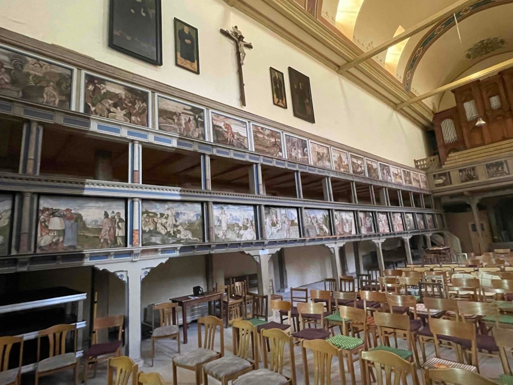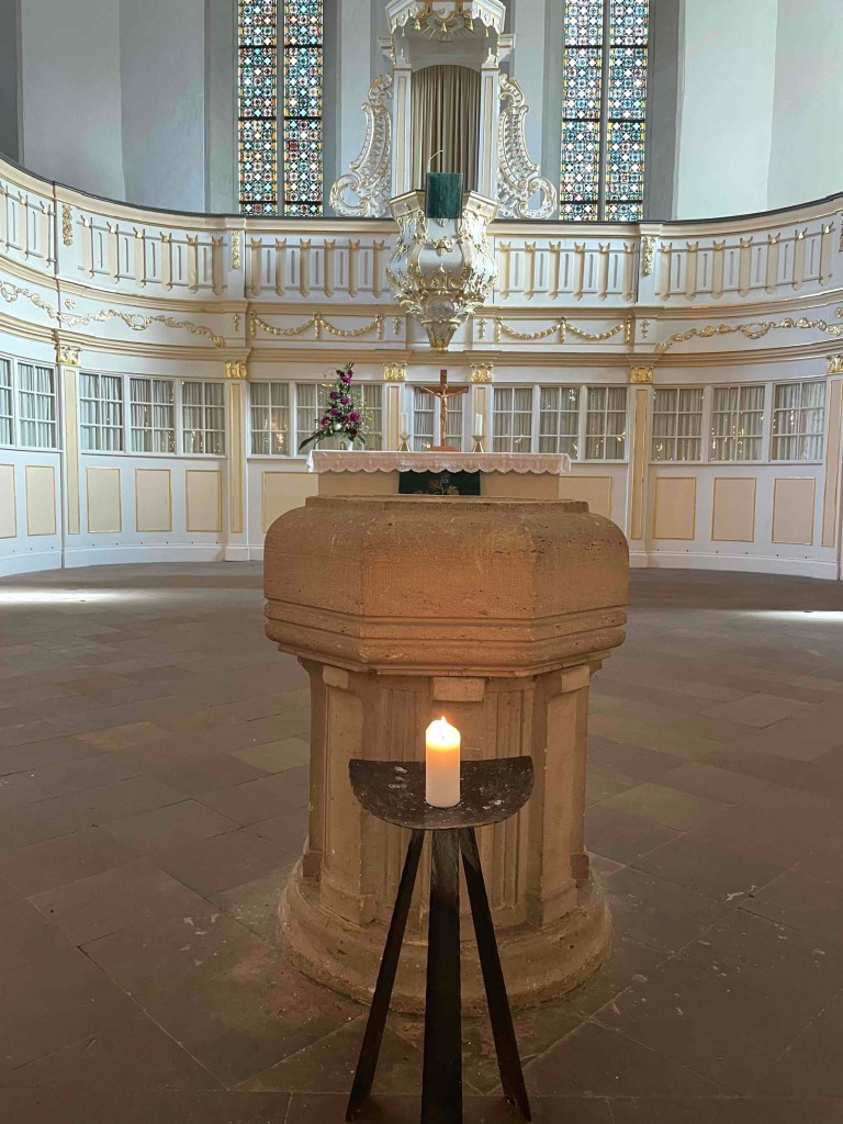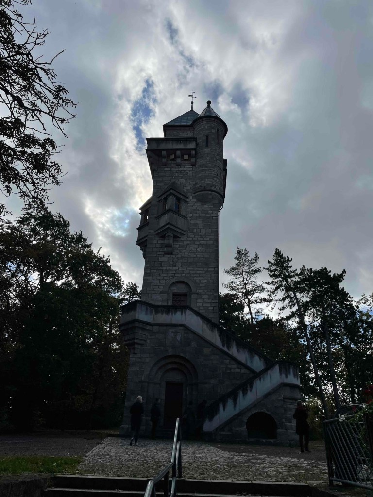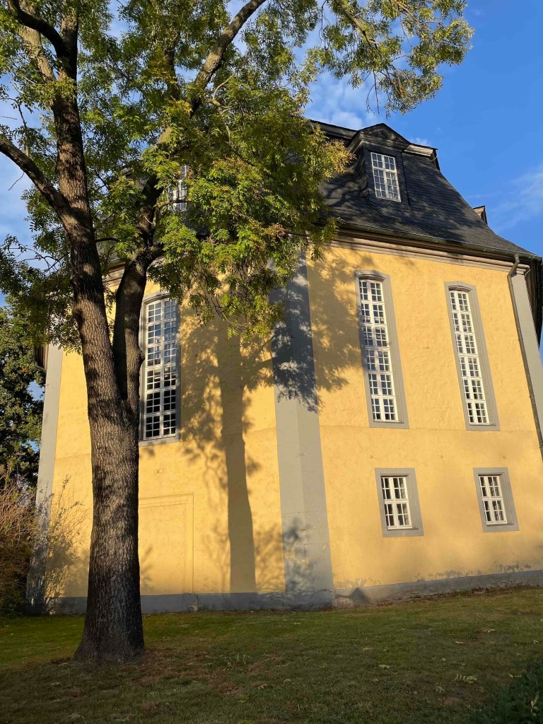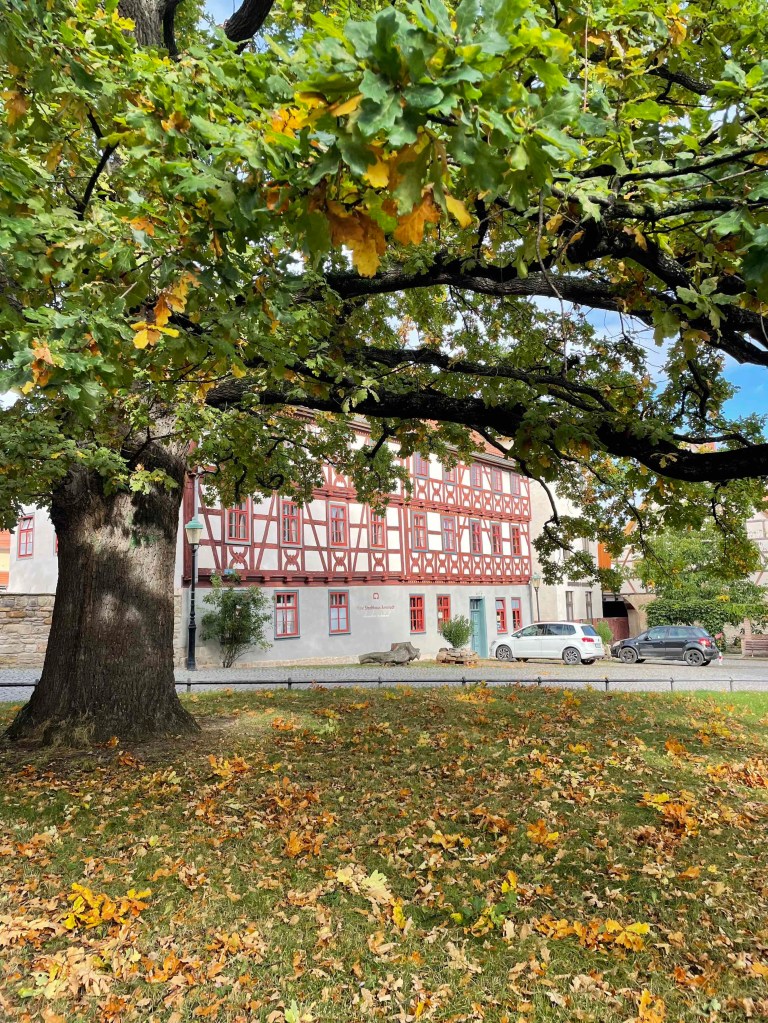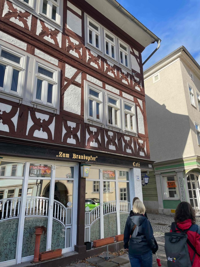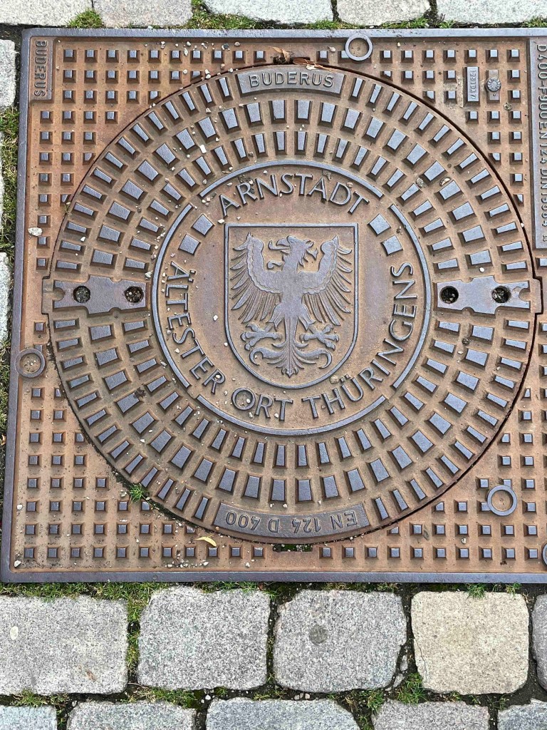 The next morning, rain pelting the glass roof of the brewery restaurant. Long faces. But the rain radar promised sunshine around 11 a.m. After breakfast, the Härtlein tour group was picked up at the hotel by the city guide and led through Arnstadt for over two hours. To be on the safe side, we took umbrellas with us, because if we had them with us, it wouldn’t rain. And the sun came out. We got a very comprehensive insight into the history of the oldest town in Thuringia, which was first mentioned in a document in 704, whose counts and princes were all called Günter, which has four churches that couldn’t be more different, whose townscape was so well preserved by the fall of the Berlin Wall that hardly any traces of the GDR era can be found today. Just as it was noticeable in Altenburg last year. (see my blog on Altenburg: https://sylkesoxontour.wordpress.com/2022/09/11/studitreffen-in-altenburg/ )But Arnstadt is also much smaller and clearer. We enjoyed this very spirited tour of the town, and climbed a hill at the end to enjoy a view of the town. The café we had chosen for a short break was full. We were promised a table in two hours. And towers that we usually climb were there, but either closed or dilapidated.