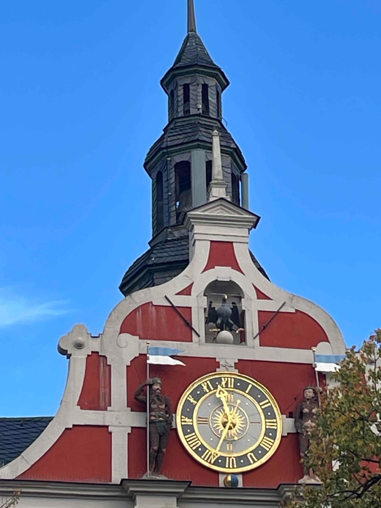 Auf dem Markt fand gerade ein Flohmarkt statt. Leider nicht sehr gut besucht. Eine Hochzeit. Die Uhr am Rathaus bimmelt aller Viertelstunde und der Adler aus dem Stadtwappen schlägt / wackelt mit seinen Flügeln. Sehr kurz. Man muss wirklich sehr schnell sein, um das in Film oder Bild festzuhalten.