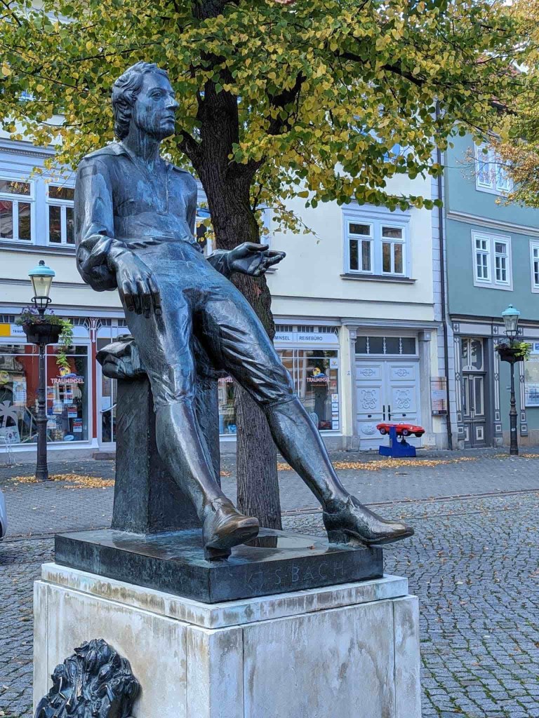 Am nächsten Morgen Regen, der auf das Glasdach des Brauereirestaurtants prasselte. Lange Gesichter. Aber der Regenradar versprach Sonne gegen 11. Nach dem Frühstück wurde die Reisegruppe Härtlein von der Stadtführerin im Hotel abgeholt und über zwei Stunden durch Arnstadt geführt. Vorsichtshalber nehmen wir Regenschirme mit, denn wenn wir die mithaben, regnet es nicht. Und die Sonne kam raus. Wir bekamen einen sehr umfassenden Einblick in die Historie der ältesten Stadt Thüringens, die urkundlich 704 erwähnt wurde, deren Grafen und Fürsten alle Günter hießen, die vier Kirchen hat, die unterschiedlicher nicht sein können, deren Stadtbild durch die Wende so gut erhalten wurde, dass man heute kaum noch Spuren der DDR Zeit entdeckt. So wie es in Altenburg im letzten Jahr aufgefallen war. (siehe mein Blog zu Altenburg: https://sylkesoxontour.wordpress.com/2022/09/11/studitreffen-in-altenburg/)Aber Arnstadt ist auch viel kleiner und übersichtlicher. Wir genossen diesen sehr beherzten Rundgang durch die Stadt, und kletterten am Ende einen Berg hinauf, um einen Ausblick auf die Stadt genießen zu können. Das Café, welches wir uns für eine kleine Pause ausgesucht hatten, war voll besetzt. Man versprach uns einen Tisch in zwei Stunden. Und Türme, die wir sonst immer besteigen, gab es zwar, aber entweder geschlossen oder baufällig.