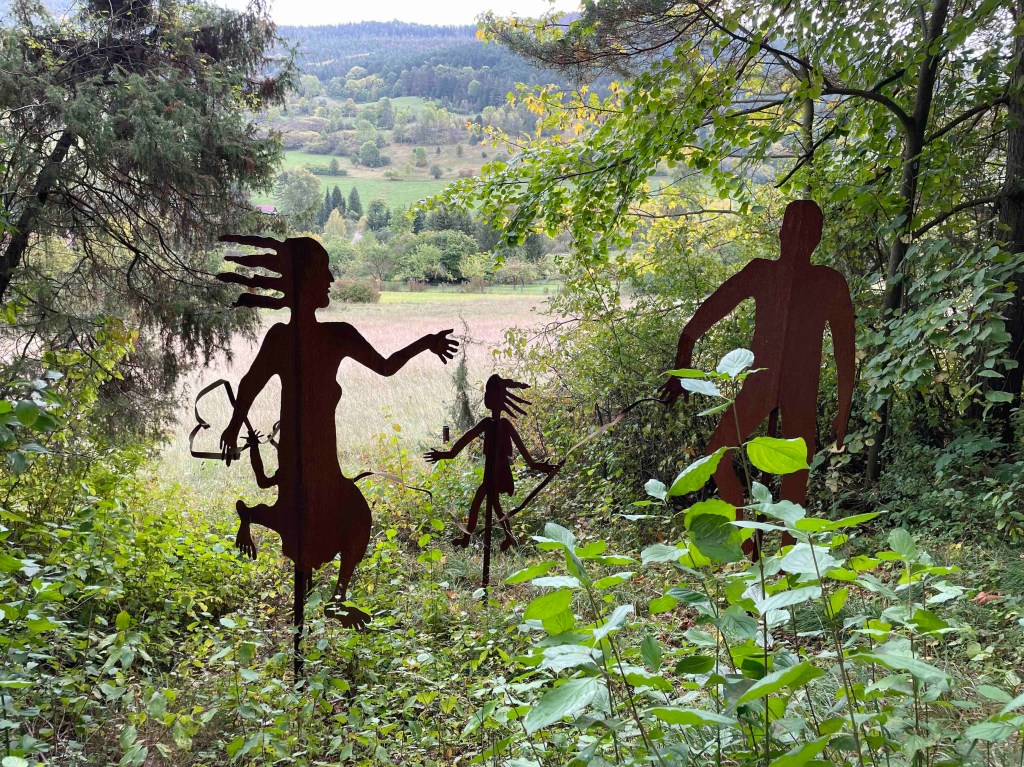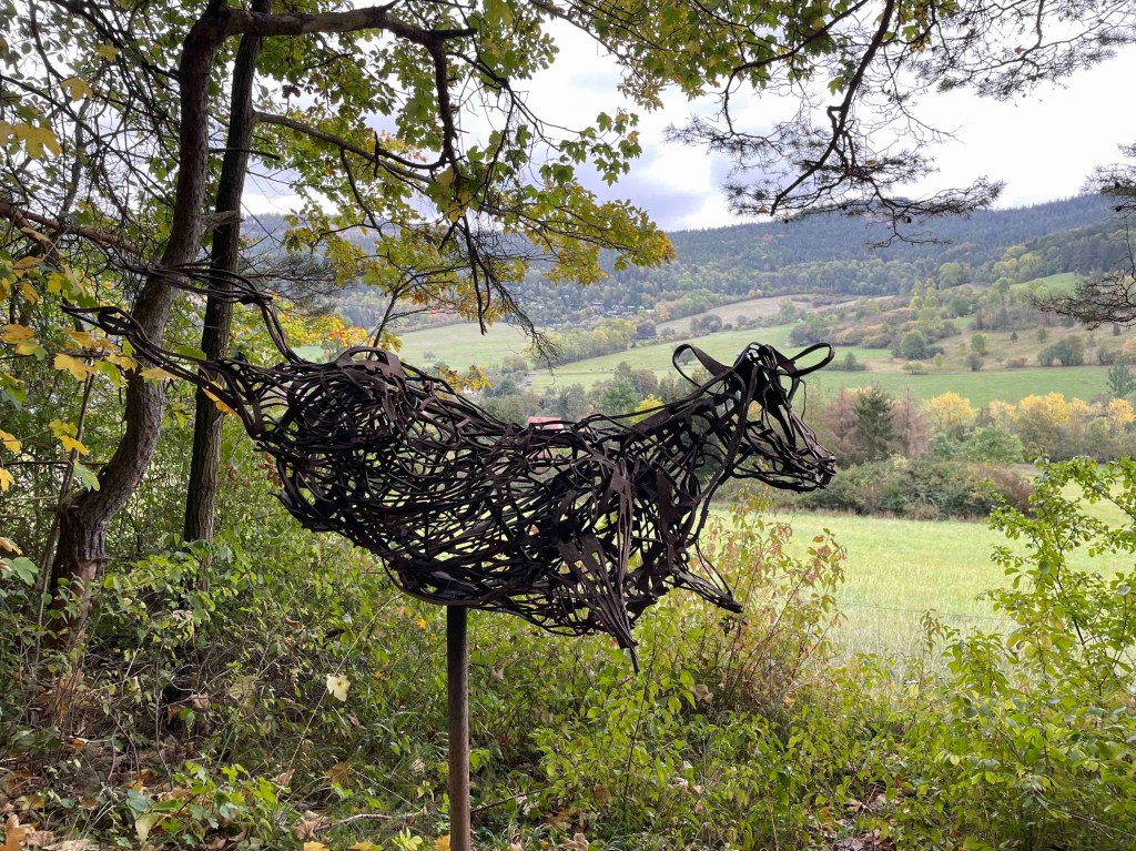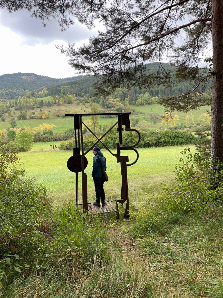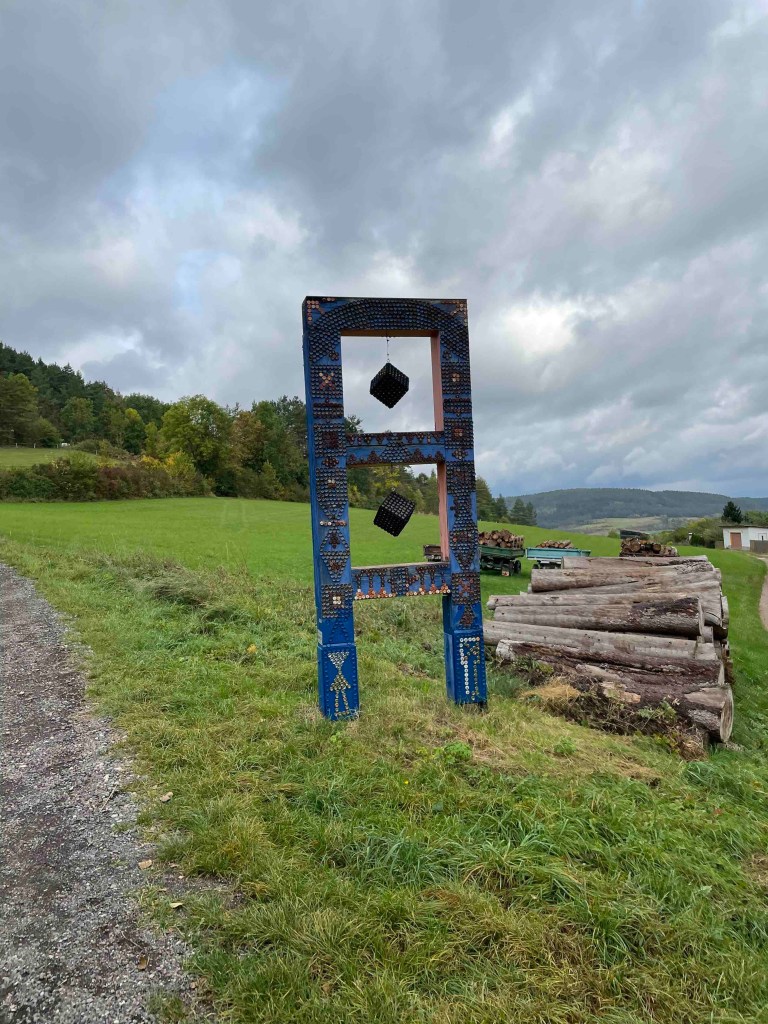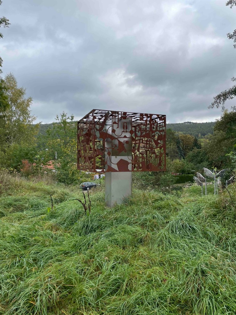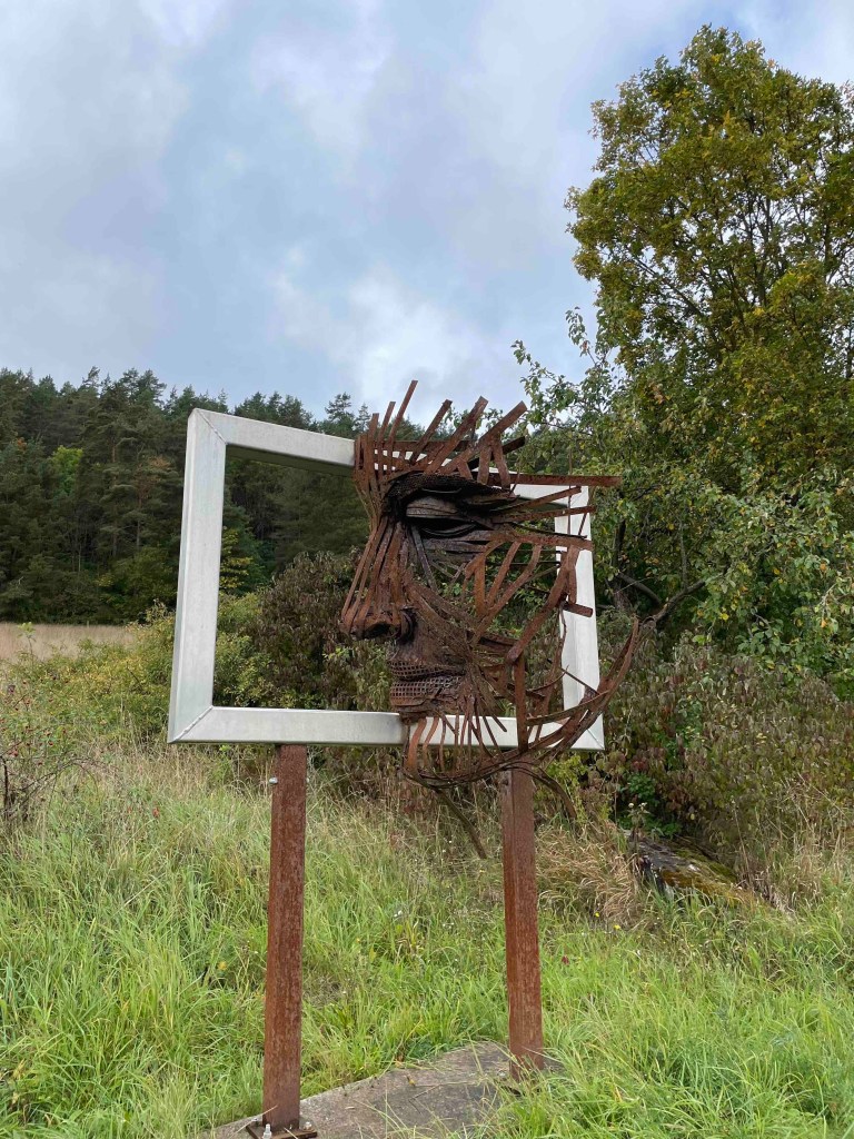 Blick auf den Regenradar auf der Wetterapp: Huuuh, 6 Grad, höchstens 8. Vor zwei Wochen hatten wir noch an die 30. Regen war zwar angesagt, aber es blieb für die verbleibenden Stunden trocken. Unsere Runde löste sich nach dem Frühstück auf. Die einen wollten zum Schloss Leutchtenburg, die anderen ins Schlossmuseum. Ich war an meinen Zug gebunden. Katrin und Matthias nahmen mich mit nach Plaue, wo wir uns auf dem Kunstwanderweg diverse Kunst anschauten, die über mehrere Kilometer im Wald und auf dem Feld verteilt wurde und jährlich anwächst. Und ganz zum Schluss genehmigten wir uns noch ein Stück Kuchen im Kunstcafé. Ich wurde zum Bahnhof nach Plaue gebracht und kurz vor meiner Abfahrt kam die Sonne nochmal raus. Was für ein Abschluss!