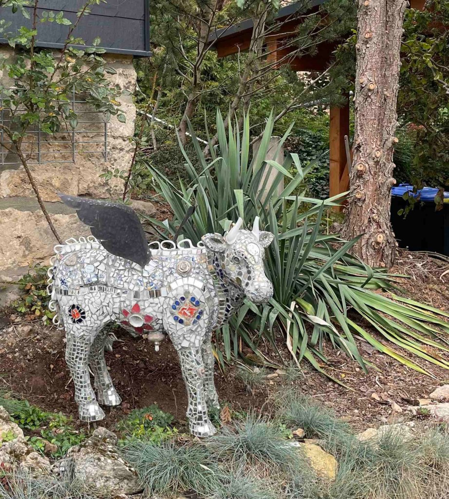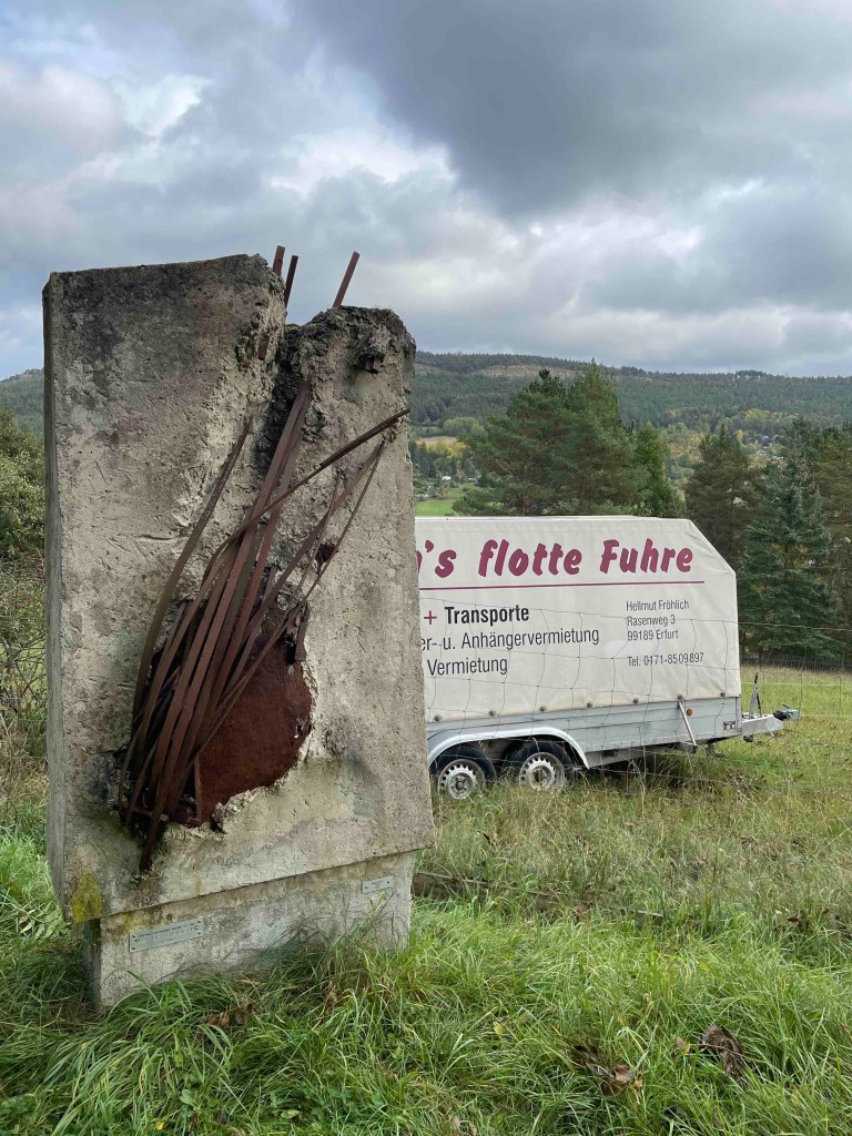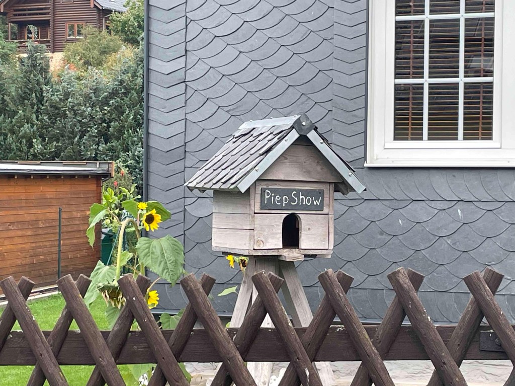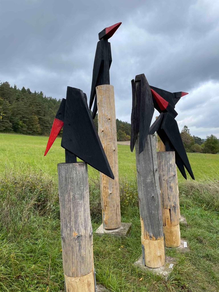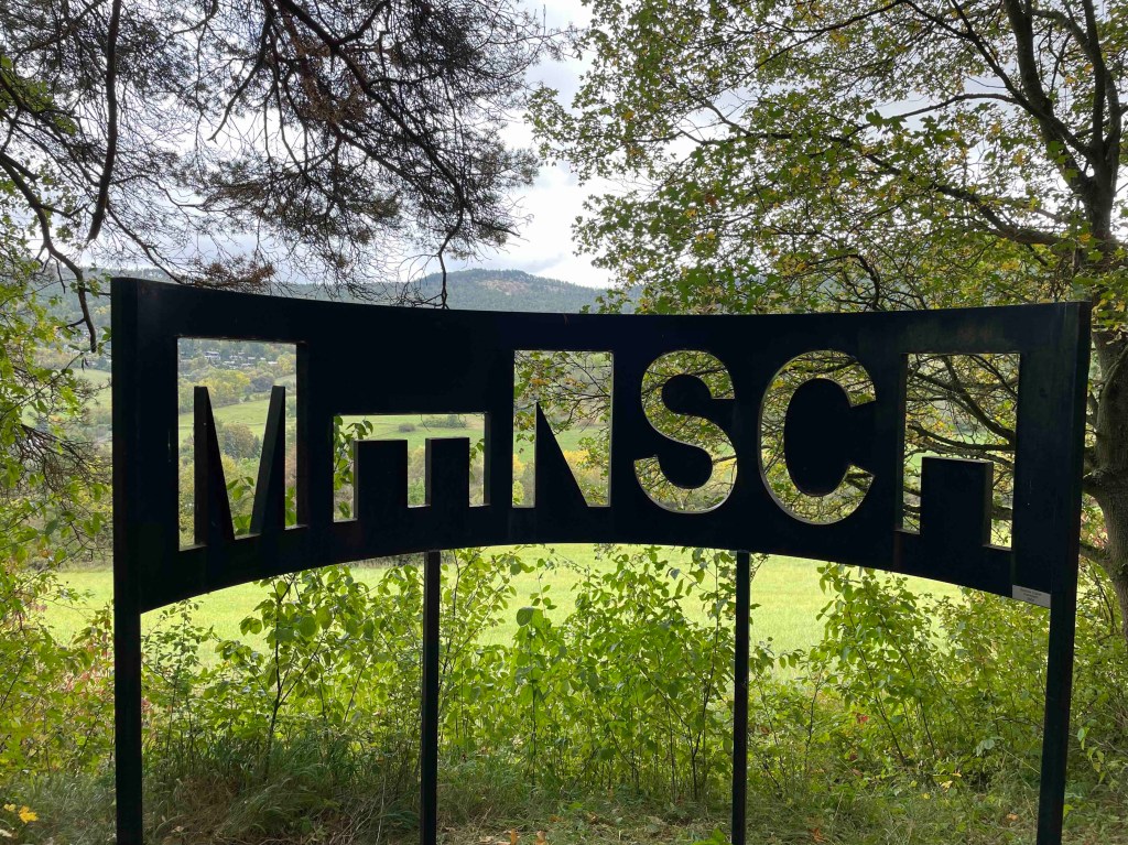 Blick auf den Regenradar auf der Wetterapp: Huuuh, 6 Grad, höchstens 8. Vor zwei Wochen hatten wir noch an die 30. Regen war zwar angesagt, aber es blieb für die verbleibenden Stunden trocken. Unsere Runde löste sich nach dem Frühstück auf. Die einen wollten zum Schloss Leutchtenburg, die anderen ins Schlossmuseum. Ich war an meinen Zug gebunden. Katrin und Matthias nahmen mich mit nach Plaue, wo wir uns auf dem Kunstwanderweg diverse Kunst anschauten, die über mehrere Kilometer im Wald und auf dem Feld verteilt wurde und jährlich anwächst. Und ganz zum Schluss genehmigten wir uns noch ein Stück Kuchen im Kunstcafé. Ich wurde zum Bahnhof nach Plaue gebracht und kurz vor meiner Abfahrt kam die Sonne nochmal raus. Was für ein Abschluss!
