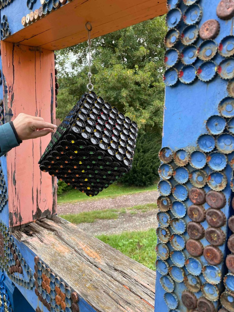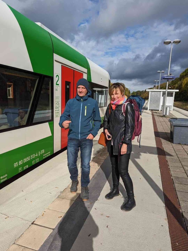 A look at the rain radar on the weather app: Whoo, 6 degrees, 8 at the most. Two weeks ago we still had around 30. Rain was forecast, but it stayed dry for the remaining hours. Our group broke up after breakfast. Some wanted to go to Leutchtenburg Castle, others to the castle museum. I was tied to my train. Katrin and Matthias took me to Plaue, where we looked at various art on the art trail, which is spread over several kilometres in the woods and fields and grows every year. And at the very end, we treated ourselves to a piece of cake at the art café. I was taken to the train station in Plaue and just before I left, the sun came out again. What a way to end the day!