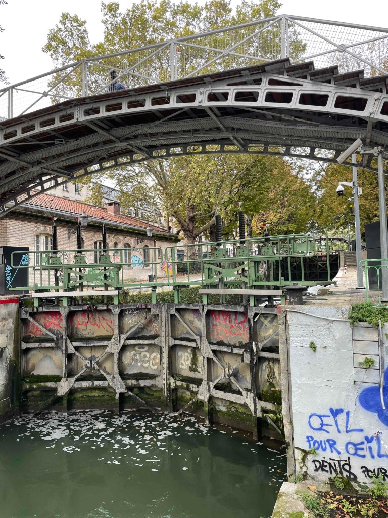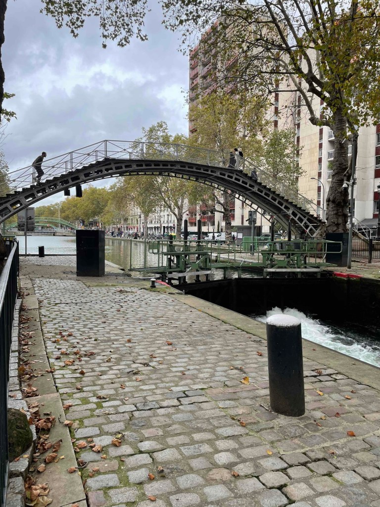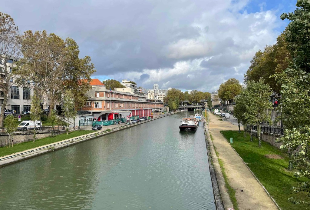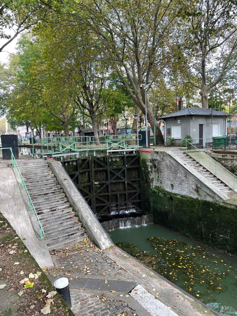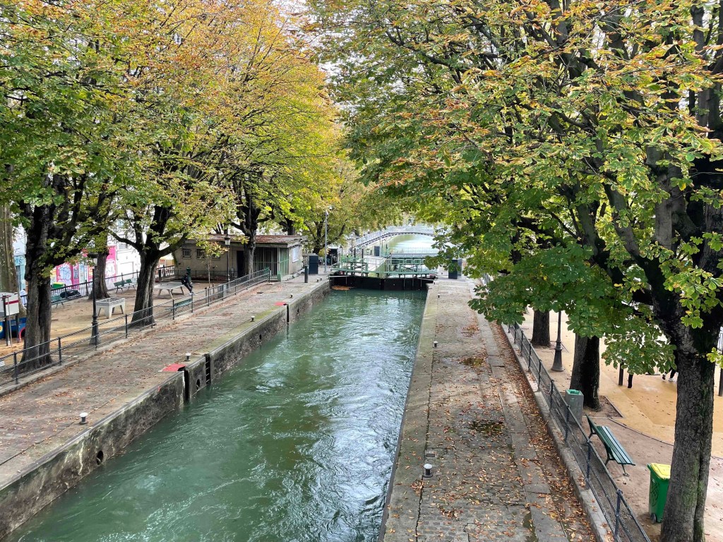 No 2: By Métro to Jaurès, where the Canal St. Martin is very close by. I can hardly remember having been there before. If I have, then only very briefly. Today I want to walk it from north to south, enjoy the atmosphere. Very quickly I am in the middle of it. It is relatively quiet. Perhaps because autumn has arrived. A few walkers. Nevertheless, almost all the benches were occupied. I imagine what the hustle and bustle is like in summer. Young people sitting on the quay walls, putting their bare feet in the water where they can. Lots of boat traffic on the canal. The lock keepers are busy. But no, everything is automatic now. Every 100 m there is a passerelle – a pedestrian crossing, several steps up and down. And for the lazy ones who don’t like stairs, there’s a normal bridge next to it. The cafés along the canal are all busy. People enjoy the last rays of sun outside with an espresso or glass of wine.
