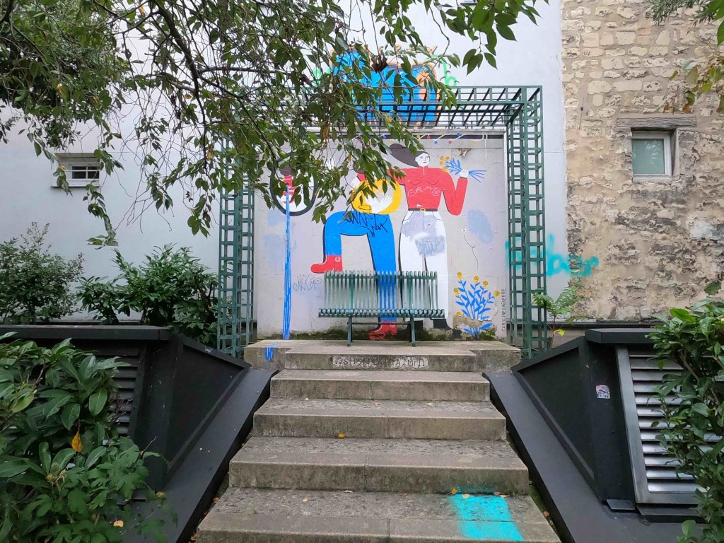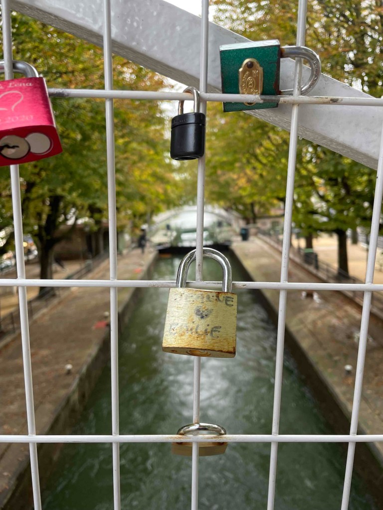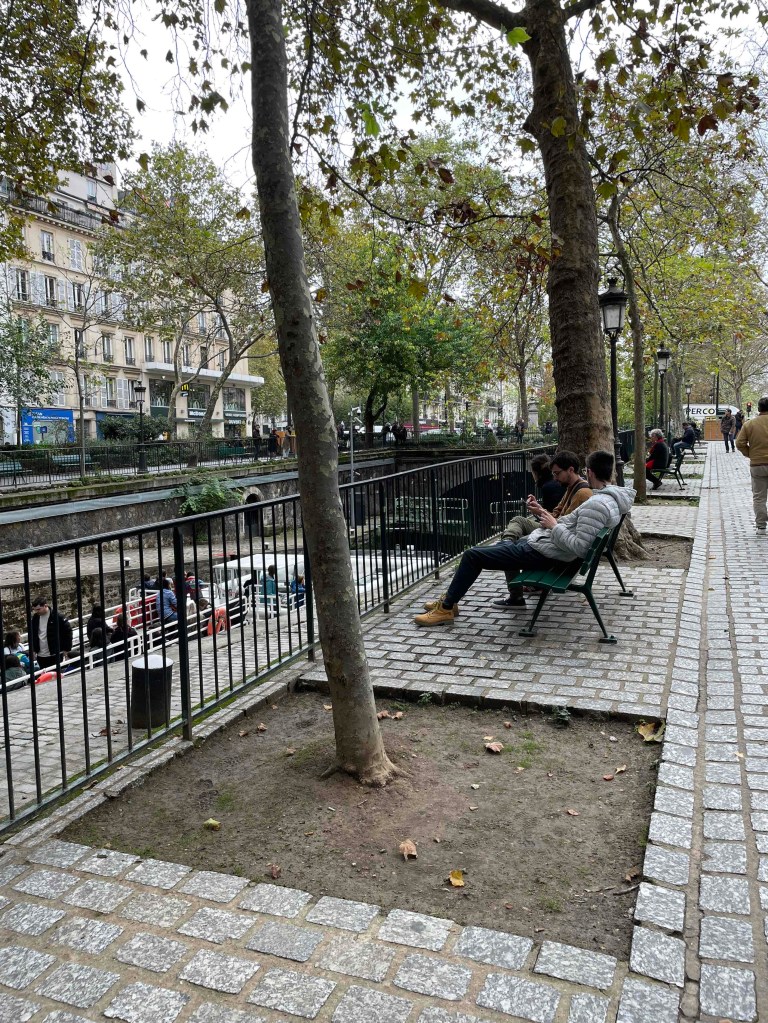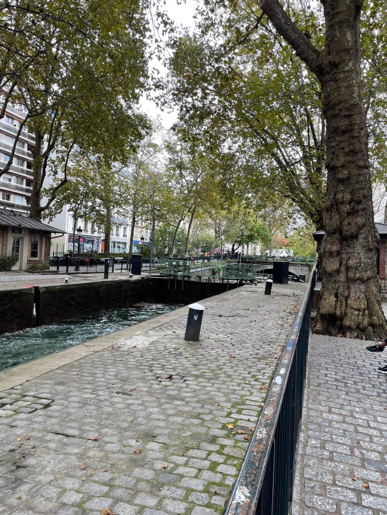 No 2: By Métro to Jaurès, where the Canal St. Martin is very close by. I can hardly remember having been there before. If I have, then only very briefly. Today I want to walk it from north to south, enjoy the atmosphere. Very quickly I am in the middle of it. It is relatively quiet. Perhaps because autumn has arrived. A few walkers. Nevertheless, almost all the benches were occupied. I imagine what the hustle and bustle is like in summer. Young people sitting on the quay walls, putting their bare feet in the water where they can. Lots of boat traffic on the canal. The lock keepers are busy. But no, everything is automatic now. Every 100 m there is a passerelle – a pedestrian crossing, several steps up and down. And for the lazy ones who don’t like stairs, there’s a normal bridge next to it. The cafés along the canal are all busy. People enjoy the last rays of sun outside with an espresso or glass of wine.