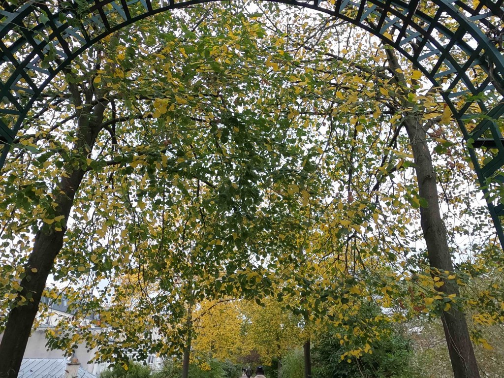 Um auf das Viadukt zu gelangen, muss man ein bisschen suchen. Googlen hat kein Zweck. Deshalb Augen auf und sich immer mal umdrehen. So fand ich den unscheinbaren Aufgang zur Coulée Verte, die ähnlich angelegt ist wie der Highline Park in New York. Nur ist jetzt nicht mehr so viel los. Die Bäume im herbstlichen Gelb, Braun und Rot. Ein paar verkümmerte Restrosen. Und rechts und links erstreckt sich die Großstadt. Tolle Sache, die man da aus dem alten Viadukt gemacht hat. In den Bögen unter dem Park – Geschäfte, Restaurants. Und jeder Bogen ist belegt. Keine freistehenden Geschäfte. Was macht man hier anders? Die Mieten sind doch in Paris sicher auch astronomisch, astronomischer als in Berlin.