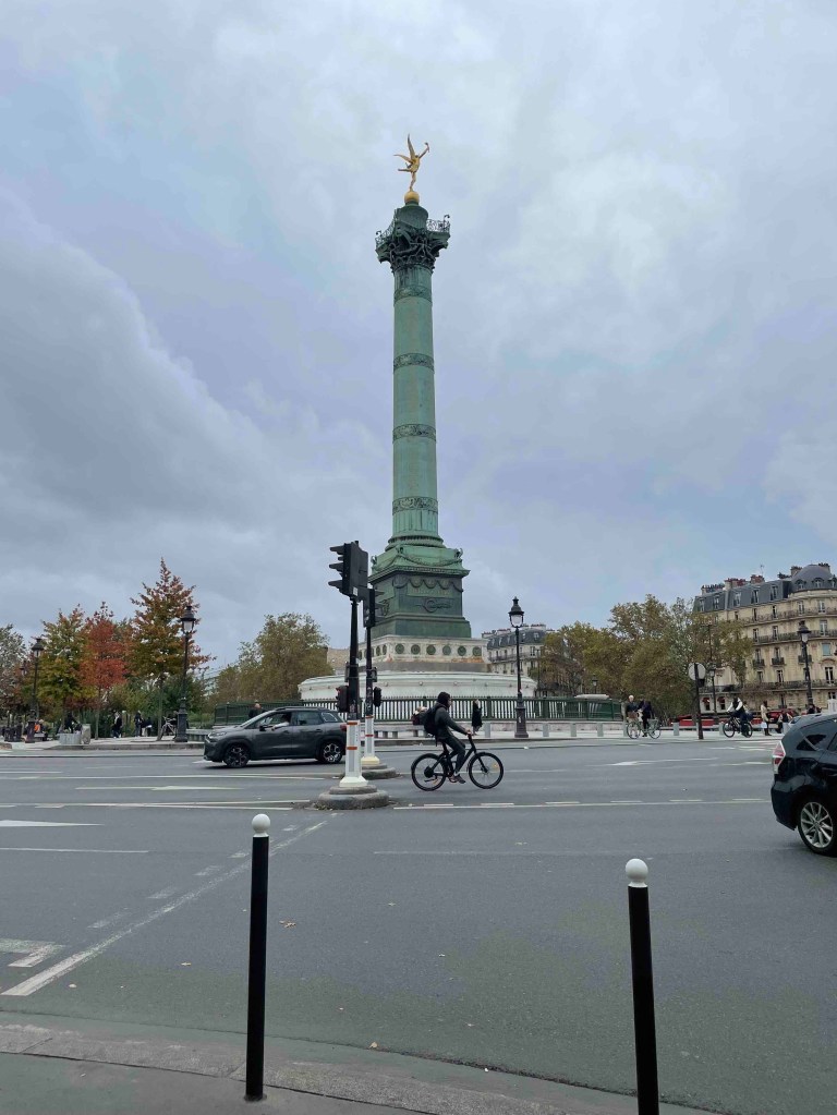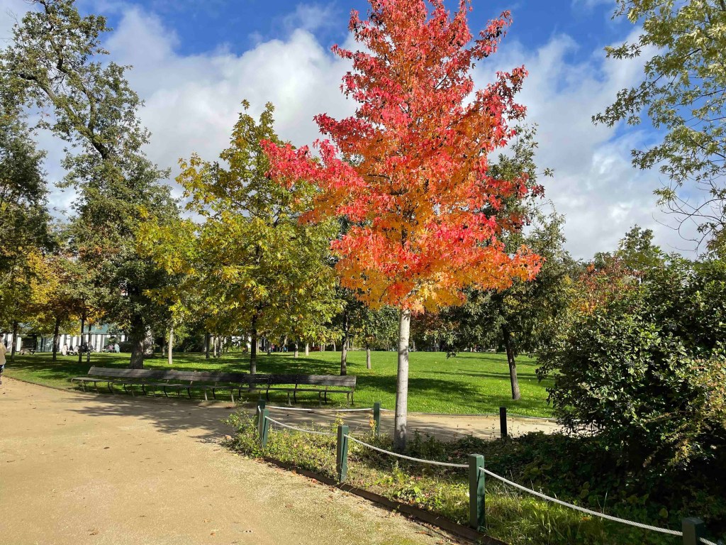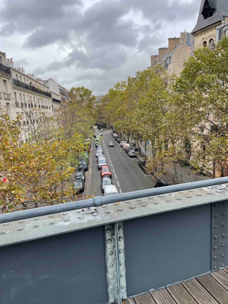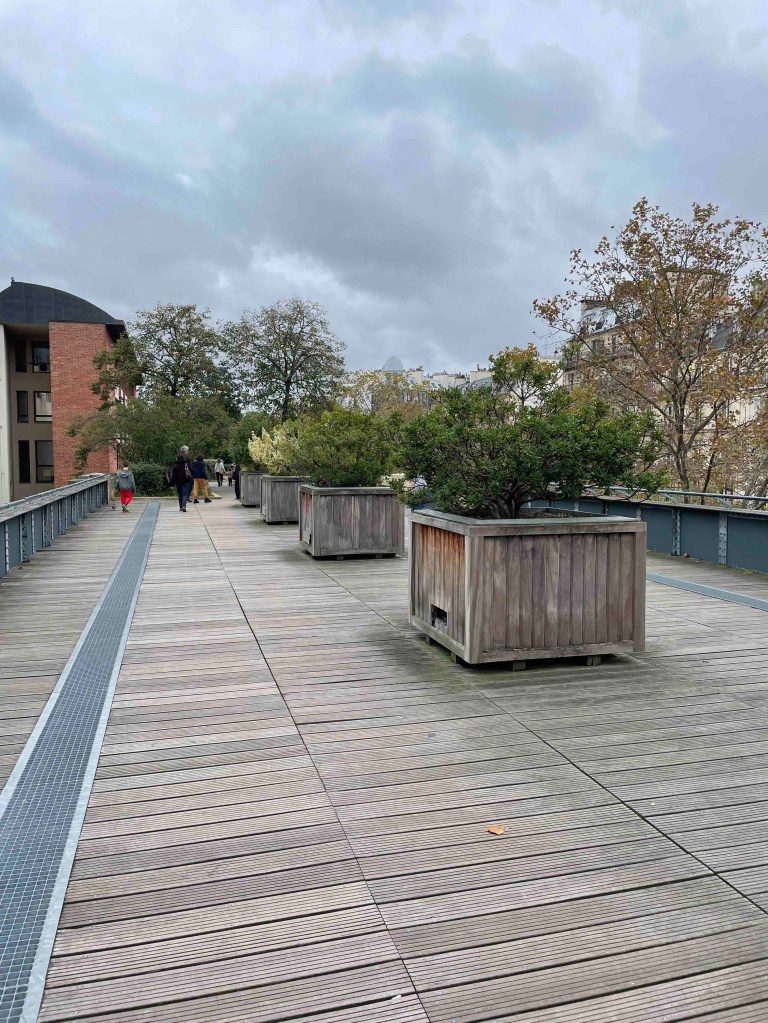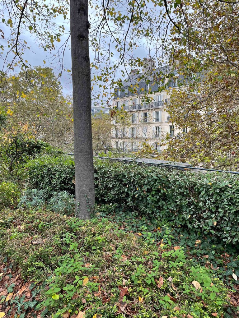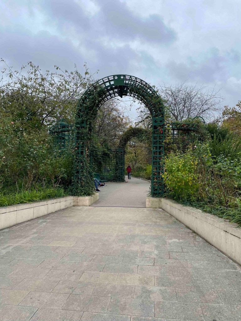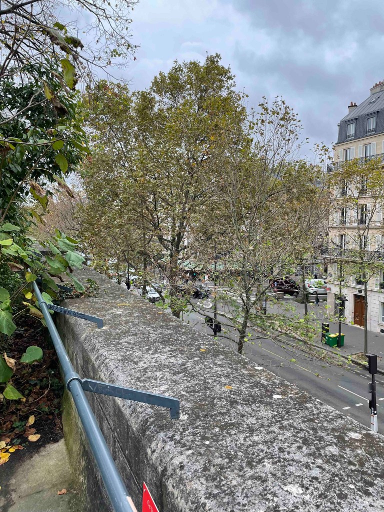 To get to the viaduct, you have to search a bit. Googling is useless. So keep your eyes open and always turn around. That’s how I found the inconspicuous stairway to the Coulée Verte, which is laid out similarly to Highline Park in New York. Only now there is not so much going on. The trees in autumnal yellow, brown and red. A few stunted remnant roses. And the big city stretches out to the right and left. What a great thing they’ve done with the old viaduct. In the arches under the park – shops, restaurants. And every arch is occupied. No free-standing shops. What do they do differently here? The rents in Paris are surely astronomical too, more astronomical than in Berlin.