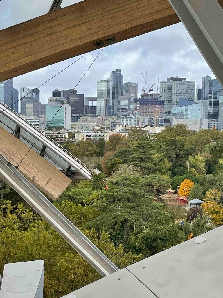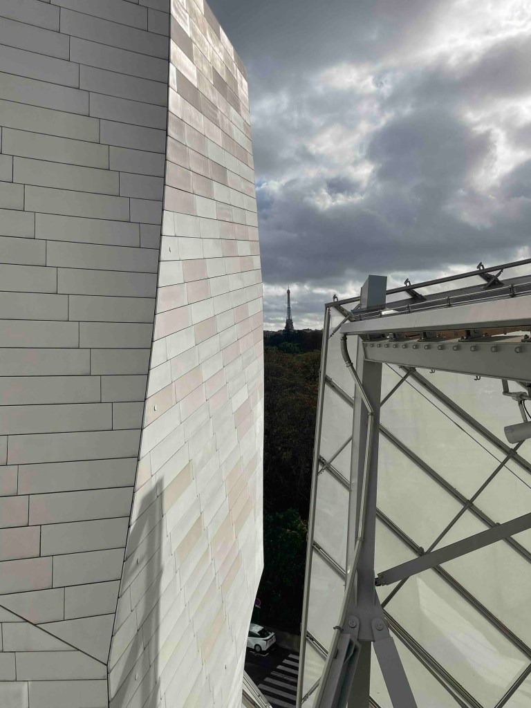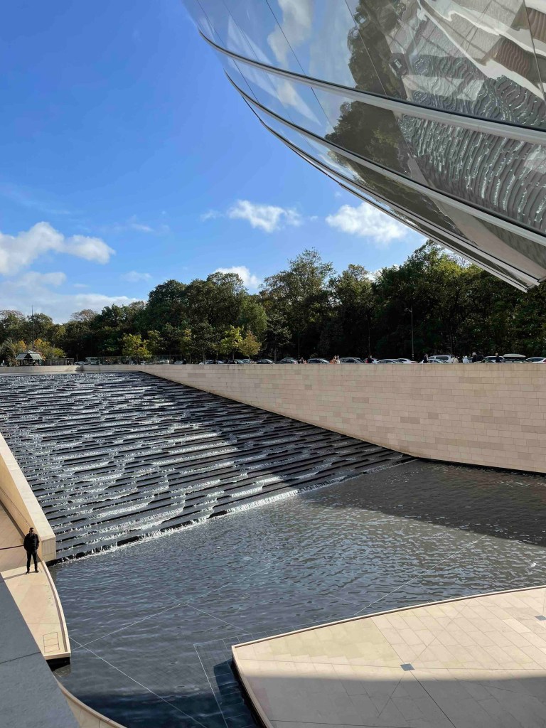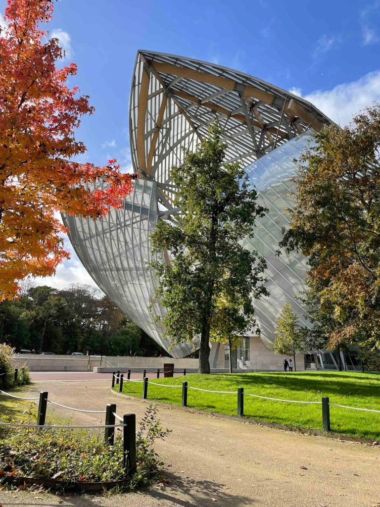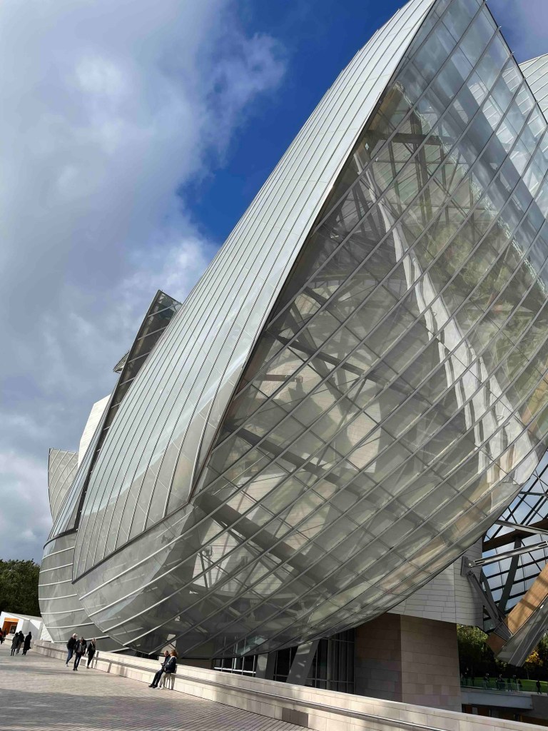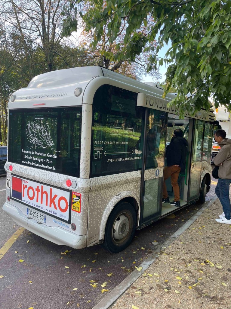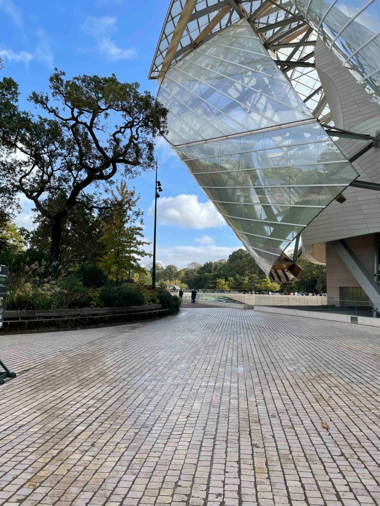 There are still 9 things on my Paris bucket list, 3 per day. And for today, I’ve chosen the Fondation Louis Vuitton in the Bois de Bologne. How do I get to the Bois de Bologne? You can take a shuttle from Place Charles de Gaulle – Etoile (Arc de Triomphe) directly to the Fondation, for an additional €2 to the ticket for the Fondation. This shuttle is a mini-electric bus that heats up Avenue Foch to the Bois de Bologne. Everything rattles and wobbles. An adventure in itself. But at least it’s more interesting than sitting underground in the Métro and not noticing what’s happening above.