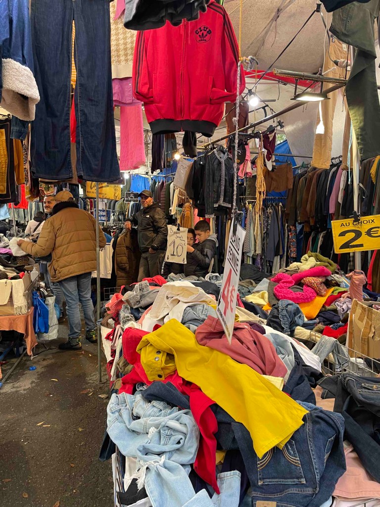 Das Wetter hält sich. Die Frisur nicht, denn es ist ziemlich windig. Letzter Anlaufpunkt für heute, für den Kurztrip nach Paris: ein Flohmarkt. Schock! Was ist das? Ein Menschenauflauf. Polizei, die illegale Händler verscheucht. Die lassen ihre ganze ‚Ware‘ stehen und hauen ab. Vorbeikommende ’sammeln‘ sie ein. Aber was verkaufen die hier? Das sind doch nur Lumpen, altes Zeug. Wer kauft das? Ich fühle mich nicht wohl. Auch der Markt selbst hatte mit Flohmarkt nichts zu tun. Berge von Klamotten, Schuhen für 1 €. Nichts sortiert. Es roch merkwürdig. Mir wurde übel, ich hätte mir den Flohmarkt sparen können. Schade.