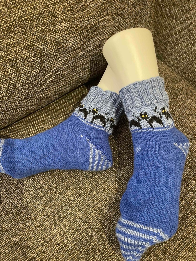 Fehlt noch die sylkesox – Ausbeute des Jahres 2023. Ich bin etwas auf Abwege geraten. Aus Socken wurden Pullover, Tücher, Kuscheltiere. Ab und an gab es ein paar Socken in außergewönlichen Designs wie immer. Im Moment verarbeite ich die Reste von 2023. Es wird sehr bunt. Und was ist mir am besten gelungen? Das Mobilé für Alma, meine Nichte.