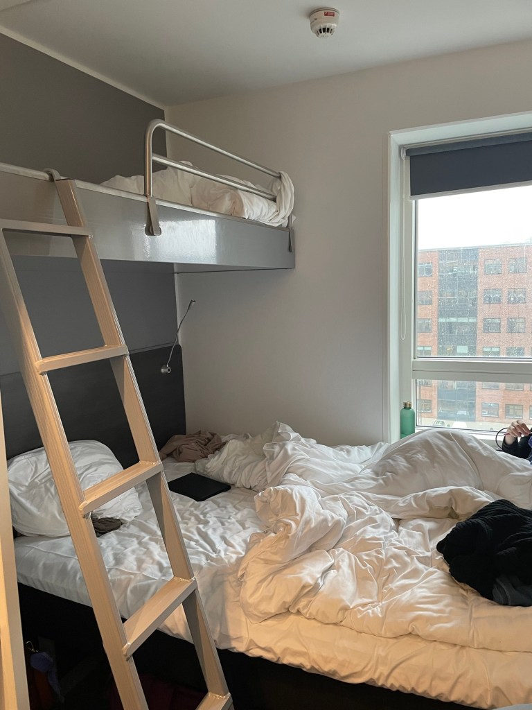 Bis zum Hotel Cabinn sind es nur zwei Stationen. Hätte man auch laufen können. Und das mit dem Ein-und Auschecken im Bus müssen wir wohl auch nochmal üben. Wir bezogen unser Minizimmer – 9 Quadratmeter. Erinnert sehr an die französischen Etaphotels, nur noch winziger. Bisschen wie Sardinenbüchse. Brauchen wir ja nur zum Schlafen.