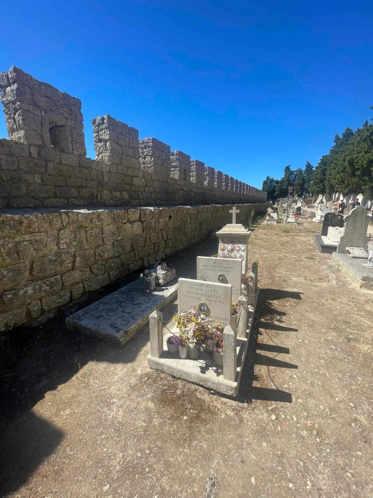 At the fortress there is a simple little church to admire and a cemetery along the fortress wall. The church, which of course has azujelos, looks brighter than all the other churches we have seen so far. This is probably due to the plain white wooden ceiling of the nave. We have a great view of Sesimbra from the wall. One last time, because our journey continues to Setubal, the last stop on our vacation before we head back to Berlin in two days.