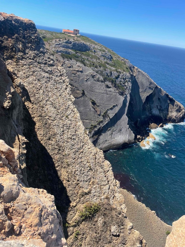 We drive on to Farol Cabo Espichal , a lighthouse on the Espichal rock. I discovered several hiking tours around the lighthouse and the rock on Komoot. They ranged from 3 to 15 km. We did a mini loop and stood on the precipice. The roaring sea below us. Wow!!! No barriers. This really is an adventure. Too bad it’s so hot. With appropriate footwear and less sun, I would have liked to tackle a longer round.