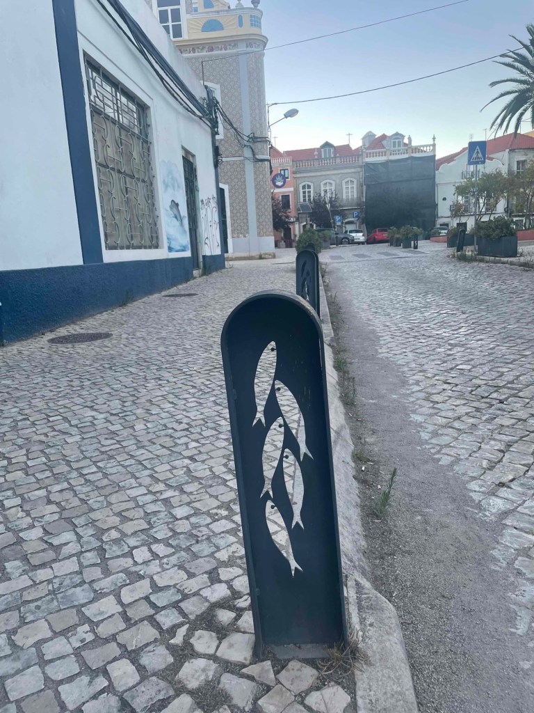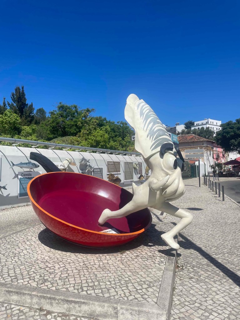 We decide on Setubal, the city of funny sculptures. A frying pan with a fleeing fish, an oversized cat walking on a roof, dolphins in the park, and many more.