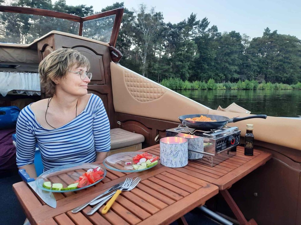 In an hour we are at the jetty in Hessenwinkel / Köpenick, receive comprehensive instructions from the owner on how to handle the boat, stow our few things and cast off. The sun is slowly setting. Not much time left. My skipper heads for the first lake – Seddiner See – and we soon find a nice spot to anchor. We quickly jump into the water again, cook a quick meal on the spirit stove and enjoy the sunset by candlelight. There are hardly any mosquitoes. And it feels incredibly good: a balmy summer evening in September on Lake Seddin. Escaping the heat! The air traffic from BER, which takes off over the lake, decreases and stops completely around 10 o’clock. It is as quiet as a mouse.