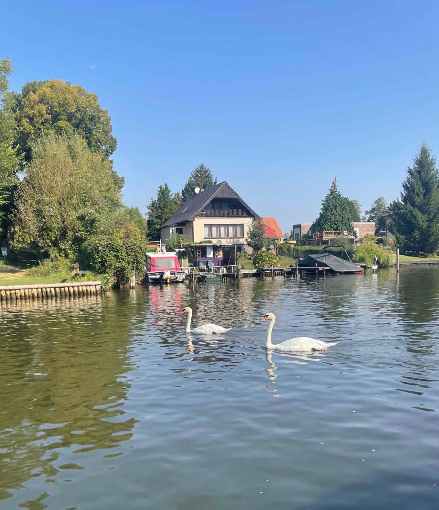 And in the morning, the sun’s rays tickle us out of our feathers. A heron stands on the bank and watches us. For breakfast, we get a visit from the swan, who was so pushy and hissed at me because I didn’t give him the right part of my breakfast. He didn’t want eggshells. ‚Morning wash‘ in the lake. And we weigh anchor and sail towards Erkner.