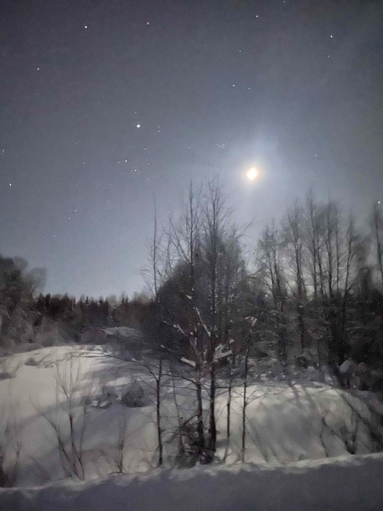We try it out and trudge through the snow in the twilight. There are a few huts in the forest, some with huge glass windows. Almost all of them are probably holiday cabins. The road to the lake is cleared. There are small sauna huts by the lake. Cool. I test my moon boots and trudge through the snow – test passed.