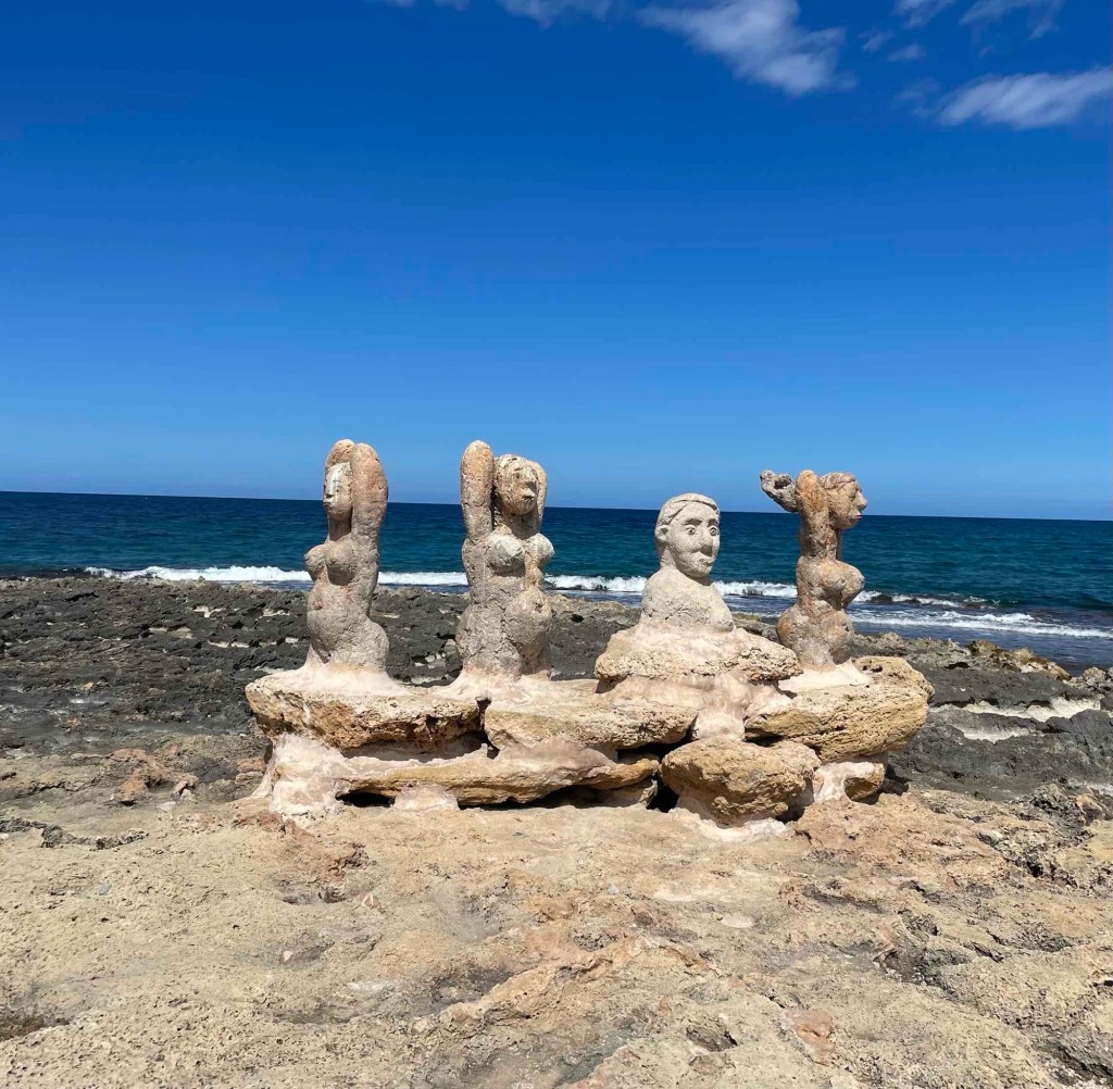 We set off for Son Baulo in the afternoon. With sun protection factor 50, walking boots on (just me) and a route on our mobile phones, we walked along the beach promenade, where we admired the sculptures by Joan Bennassar. One funnier than the next, mostly naked ladies in the Picasso style. Next to old military bunkers, command posts (probably from the Nazi era), on the beach, on lava rocks in the sea. The village of Son Baulo is still quite sleepy. Hotels and restaurants are waiting for the high season.