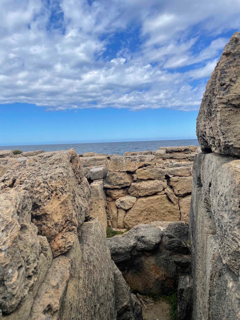 Der Wanderweg GR 222 führt entlang der Küste, sandig, felsig im Wechsel entlang des Nationalparks Son Real. Ich überrede die Familie noch ein paar hundert Meter weiterzulaufen zur Necropolis Son Real – eine Grabstätte aus dem 8. Jahrhundert vor Christus.