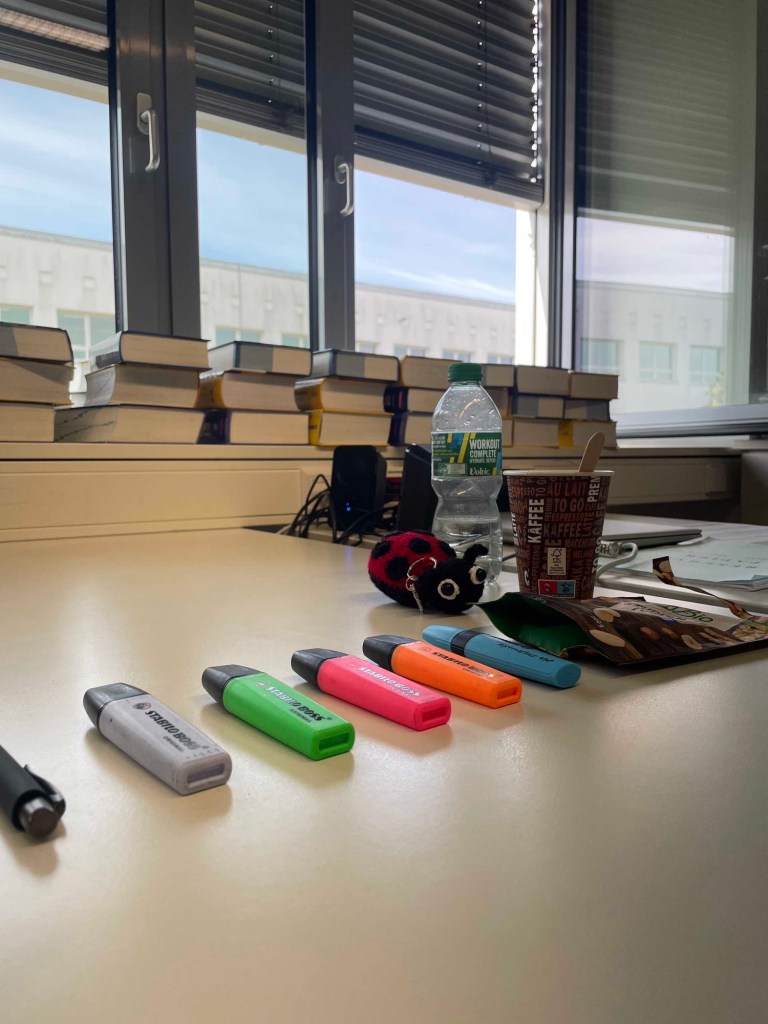 What remains to be done? My living room at the SLZB – classroom C-1.42 looks pretty sober. The sideboards that were filled with all my school supplies, books and materials are almost empty. There are still a few withered plants around. And now tears are really welling up in my eyes. How long was I responsible for this room? For an incredible 11 years, various courses and classes passed through C-1.42. Perhaps a plaque should be hung on the room at some point: Ms. Kraus taught here. Kraus with an S and without an E. This crazy woman with her sock tassel and mascots made for the Abitur students. I hope it remains a small memory of me. I will never forget you.