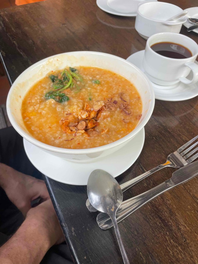 Breakfast in Malaysia, but with a Bali touch: Eggs Benedict and Balinese rice porridge with chicken—here it’s called “porridge”—spicy and filling. Exactly what we need before heading into the cooler highlands. Our destination: the Cameron Highlands.