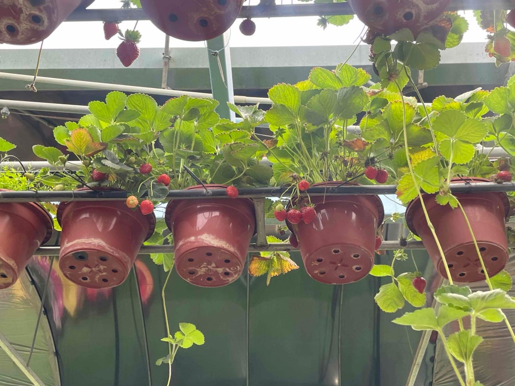 Die Landschaft verändert sich: immer mehr Gewächshäuser. Wir stoppen in den Green View Gardens – ein Mix aus Blumenparadies und Kinder-Spielplatz. Erdbeerpflanzen wachsen in Töpfen, fein säuberlich in Augenhöhe aufgereiht. Clever – so muss sich niemand bücken.