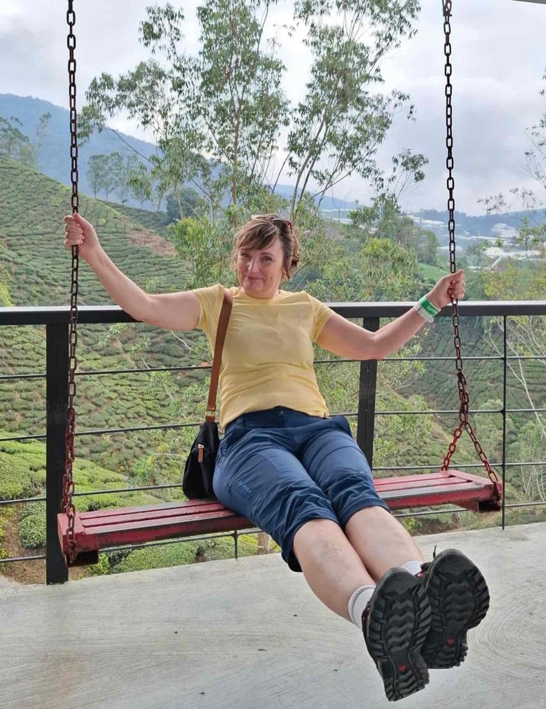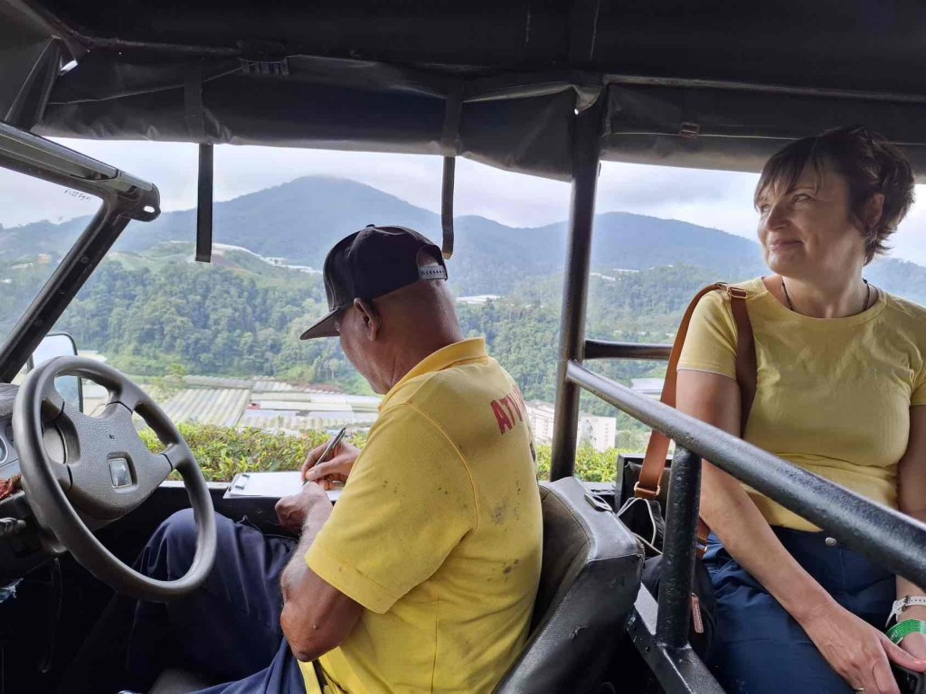 On impulse, we book a “Jeep Safari” through the tea plantation for €4 per person. Sounds adventurous, but it’s more of a photo spot with a swing over the abyss and ‘photographers’ out to make a quick buck. Tea information? None. Still, the jeep ride—steep downhill through tight curves—gives us a little adrenaline rush. Screeeech!