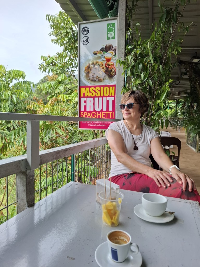 Eher auf Tourismus ausgerichtet. Man bot uns eine Safari mit dem Jeep durch die Gärten an – am Ende gäbe es sogar einen Obstteller und ein Getränk. Aber alles hat seinen Preis. Wir verzichteten, nachdem wir gestern auf der Teeplantage in den Highlands erfahren hatten, wie so eine Safari abläuft. Stattdessen setzten wir uns mit Tee, Espresso und einem Becher Obst auf die Terrasse und genossen den Blick ins Tal.