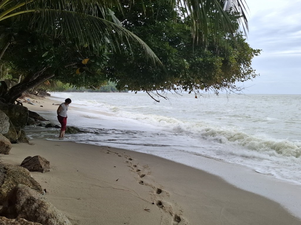 Zum ersten Mal sehen wir auf dieser Reise die Andamanensee. Zum Baden lud es nicht gerade ein: Der Strand recht schmal, das Wasser etwas unruhig. Trotzdem: Sandalen aus, Füße in den Sand und ins Wasser. Rock auch – weil ich nicht aufgepasst habe. Macht nichts, hier fühlt sich bei der hohen Luftfeuchtigkeit eh alles feucht an.
