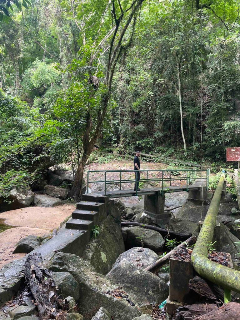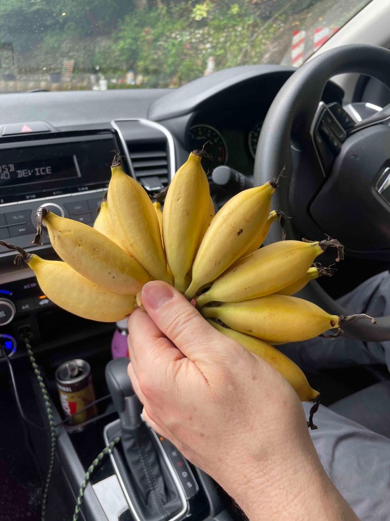 We reached our next destination via a winding road. Jungle on the right, steep drop on the left — now and then we caught a glimpse of the sea. Slightly hidden and barely signposted, we found the waterfall. Finally, we had our jungle moment. The path along the waterfall was a bit adventurous — over various water pipes and conduits. In the forest, there were squeaks and chirps, sounding a bit dangerous. We saw no animals or birds, and thankfully no lurking snakes. At the roadside, we bought bananas. They were eager to sell us more — spices like nutmeg and mace (now I finally know what they look like). We passed — with over 20 kg of luggage, we didn’t want to head to Bali with more weight.