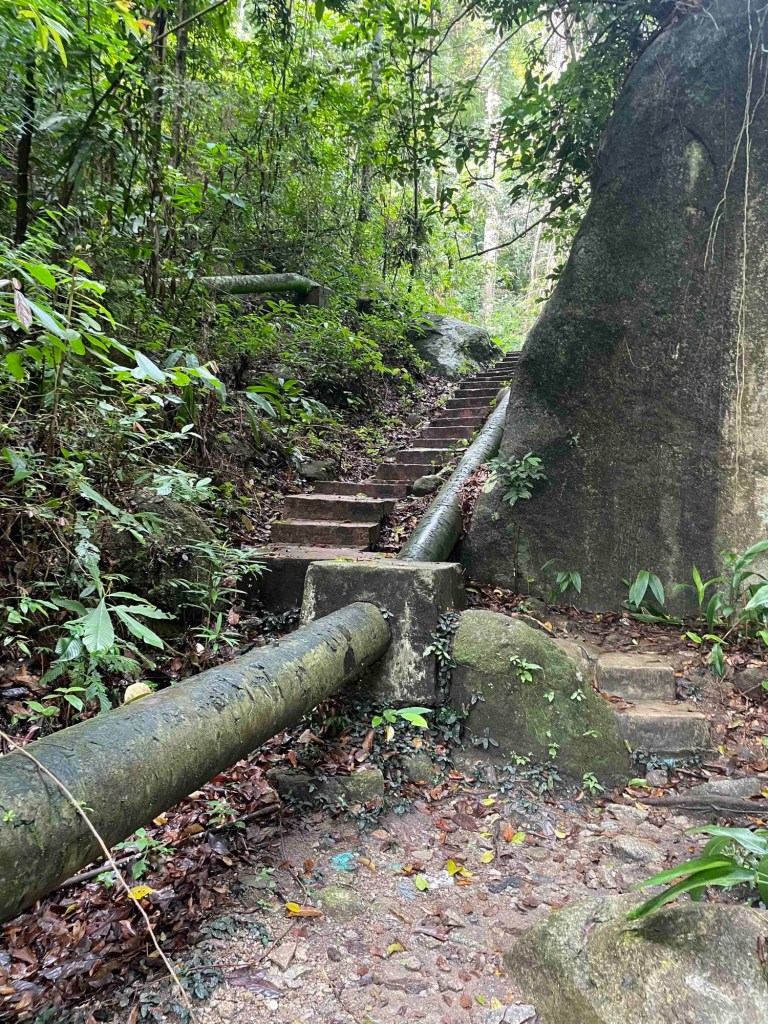 Über eine kurvige Straße erreichten wir das nächste Ziel. Rechts der Dschungel, links der Abgrund – ab und zu erhaschten wir einen Blick aufs Meer.Etwas unscheinbar und kaum ausgeschildert fanden wir den Wasserfall.Nun hatten wir endlich unseren Urwald. Der Weg entlang des Wasserfalls war etwas abenteuerlich – über diverse Wasserleitungen und Rohre. Im Wald fiepte und quiekte es, klang gefährlich. Tiere oder Vögel sahen wir nicht, und zum Glück lauerte auch keine Schlange. Am Straßenrand kauften wir Bananen. Man hätte uns gern noch mehr verkauft – Gewürze wie Muskatnüsse und Muskatblüten (jetzt weiß ich endlich, wie die aussehen). Wir verzichteten: Mit über 20 kg Gepäck wollten wir nicht nach Bali weiterreisen.