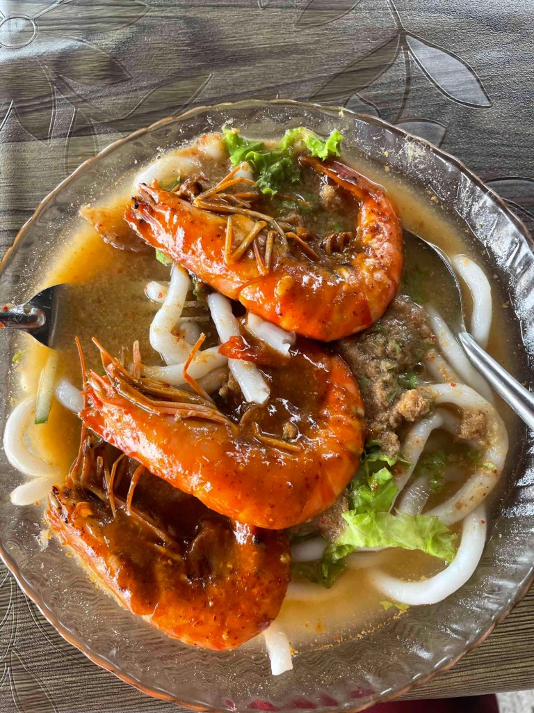 Dafür Abendessen in einer Garküche am Strand: Laksa – eine Art Fischsuppe mit Udonnudeln und gekochtem Ei. Haben wir diese Spezialität also auch mal probiert.
