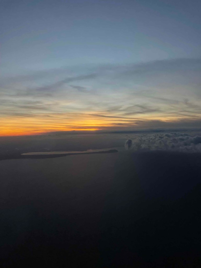 Pünktlich um 18:40 Uhr landen wir in Bali. Im Landeanflug sehen wir in der Abenddämmerung die langen weißen Strände von Lombok – Urlaubsgefühle machen sich breit. Ein Traum wird wahr.