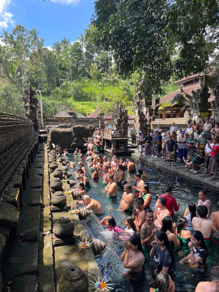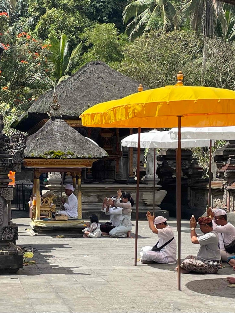 The complex is partly under water, fed by a spring into several pools. You can perform a ritual cleansing there – though that requires yet another special garment. Both believers and the “Instagram-only” crowd ducked their heads under the icy water. Not for me! Going into the water fully clothed? Dipping my head? Hairstyle ruined, no hairdryer in sight! We preferred to simply enjoy the atmosphere and watch the devotees: Pling-pling went the little bells, and after each chime, they took a flower petal and held it to their forehead in prayer.