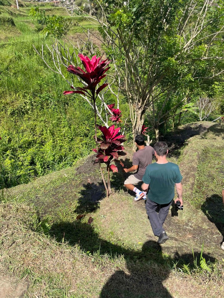 Our driver Wayan led us through the rice terraces. What can I say? Packed with tourists. The entire place felt like an amusement park: On “Aladdin’s Carpet,” you can float over the rice fields or fly headfirst like Superman. Ladies drape themselves in bright red robes, hop on swings, and pose for Instagram. In between: a few rice paddies and two or three farmers putting straw hats on tourists – all just for the photo. I tried to tune out the commotion and focus on the nature. Not easy. Still, I couldn’t resist capturing a few of these curiosities.