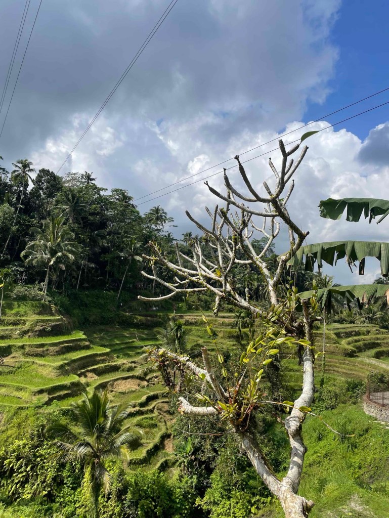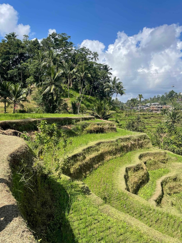 Another tourist hot spot. Wayan let us explore on our own and gave us 90 minutes. Stairs led us past the “baby waterfall” down to the main one, where swimming is possible. I had planned to just watch, but was persuaded to join in. Carefully, I waded over the rocks into the cool water – wonderfully refreshing. Afterwards, we found a restaurant with a waterfall view, ordered a snack, and enjoyed the scenery. If that’s not spiritual cleansing, I don’t know what is!