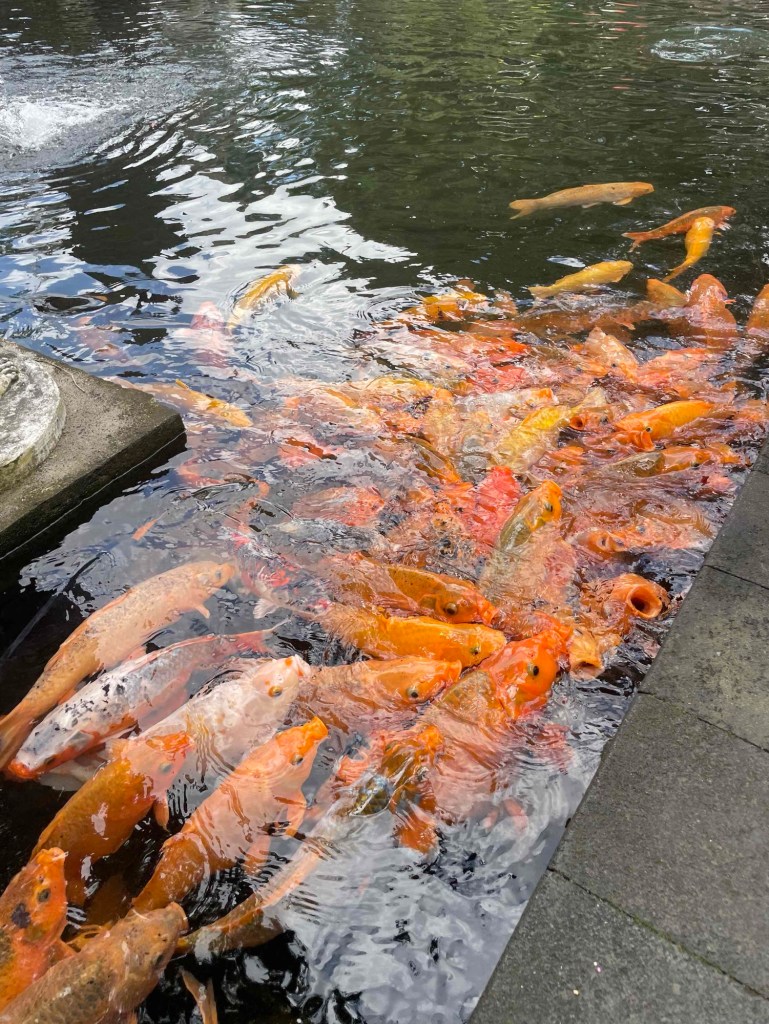 Die Anlage steht teilweise unter Wasser, gespeist von einer Quelle in mehrere Becken. Man darf sich darin auch rituell reinigen – dafür braucht es allerdings ein Extra-Gewand. Gläubige und auch einige „Nur-für-Instagram“-Besucher hielten ihren Kopf unter das kalte Wasser. Nichts für mich! Mit Klamotten ins Wasser? Kopf untertauchen? Frisur zerstört, kein Föhn weit und breit! Stattdessen genießen wir die Atmosphäre und beobachten die Gläubigen: Pling-pling läuten Glöckchen, und nach jedem Ton nehmen sie ein Blütenblatt, halten es zum Gebet an die Stirn.